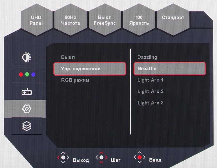 В меню установок можно выбрать статичный и один из четырех динамичных вариантов работы этой декоративной подсветки или отключить ее совсем.