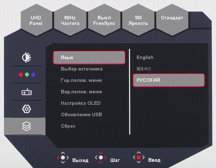 Навигация удобная, так как все делается только джойстиком, не нужно переносить палец на кнопки, к тому же списки зациклены. При настройке изображения меню остается на экране — это несколько мешает оценке вносимых изменений. Положение меню на экране можно изменить. Присутствует русская версия экранного меню.