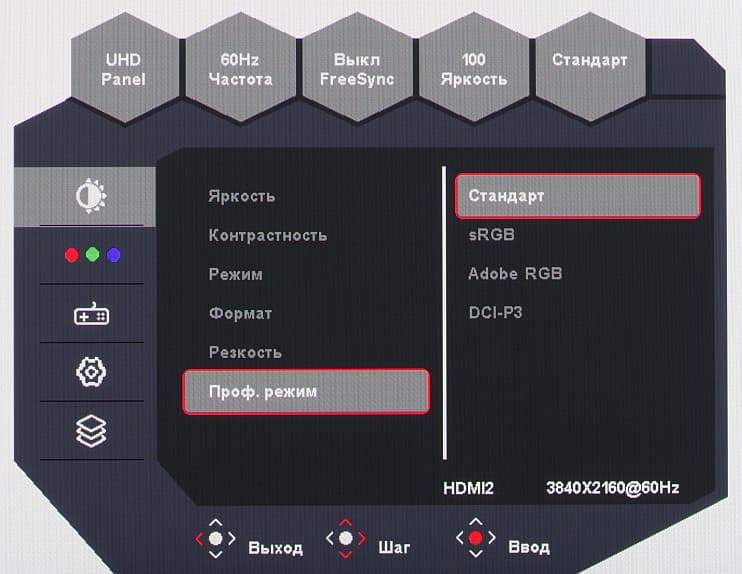 Можно выбрать один из пяти предустановленных профилей с заданными «игровыми» настройками, или один из трех обычных профилей с настройками изображения, или один из трех профессиональных, в которых корректируется цветовой охват. Во всех трех списках профилей есть еще по одному стандартному профилю, но по факту это один профиль, в котором доступны все настройки. Все остальные профили являются редактируемыми, но ряд настроек могут быть недоступными.