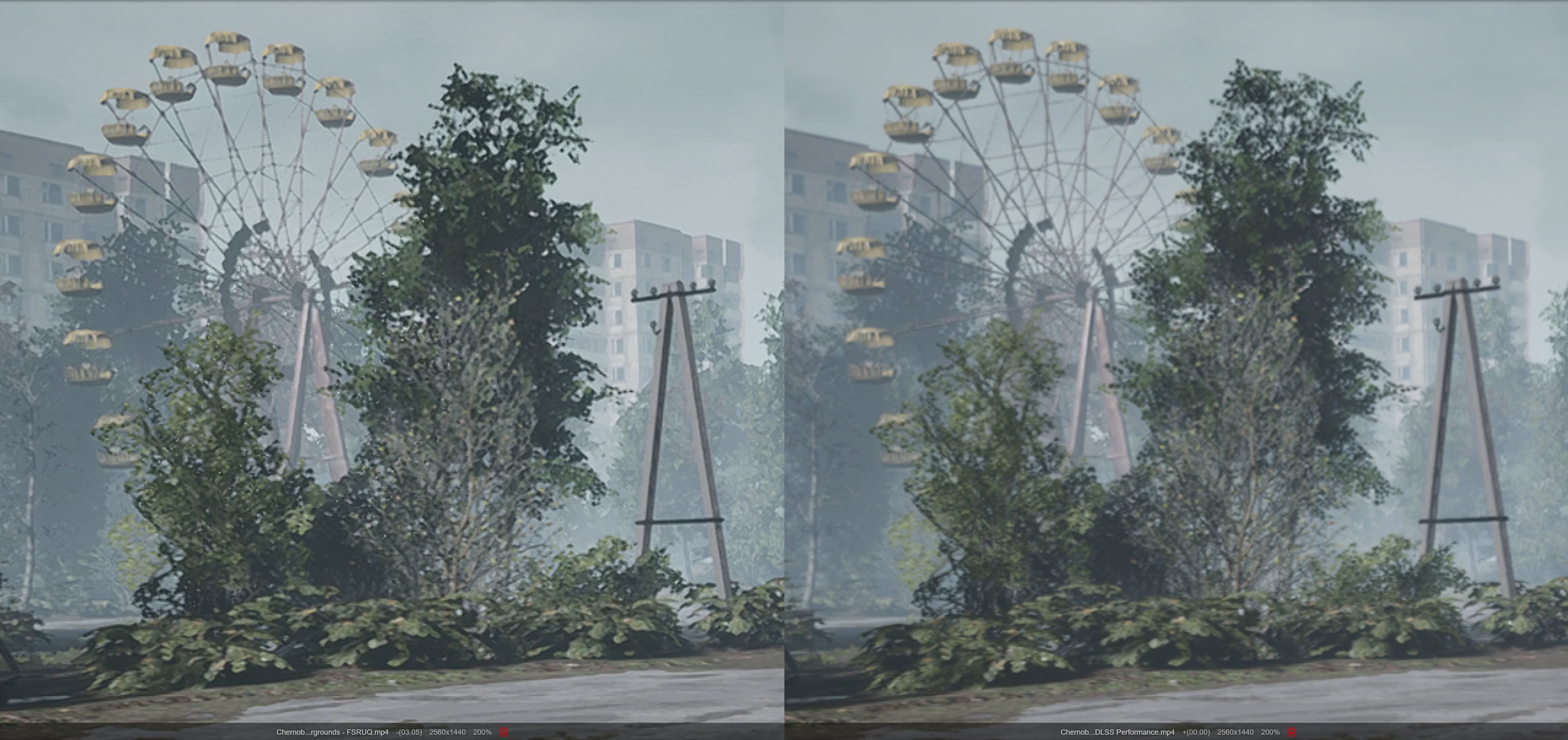 Давайте теперь посмотрим пример сравнения картинки из игры Chernobylite в видеоформате самой Nvidia. Здесь записано проигрывание встроенного бенчмарка при масштабировании теми же двумя методами: DLSS Performance и FSR Ultra Quality. На наш взгляд, на видео очень хорошо видны многие из описанных выше проблем при пространственном масштабировании изображения в этой игре: