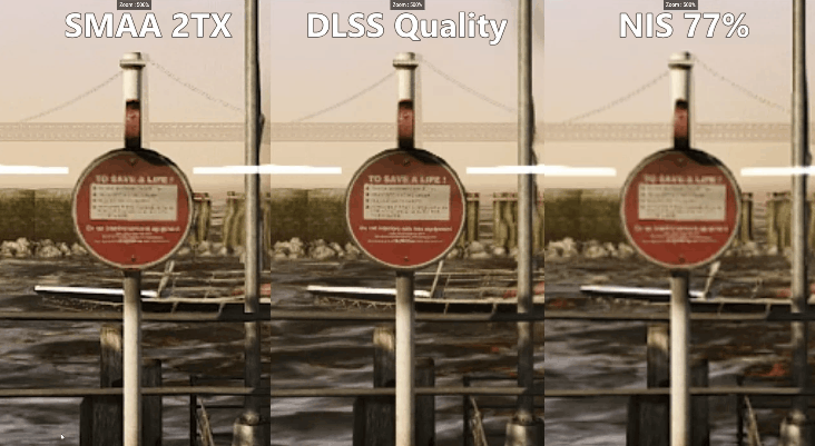 Рассмотрим отличия результатов масштабирования при помощи одного и того же метода пространственного масштабирования NIS 50% (примерно то же самое, что и FSR Performance) и NIS 77% (аналогичен FSR Ultra Quality) от картинки родного разрешения со сглаживанием: