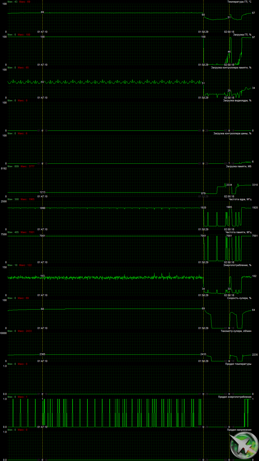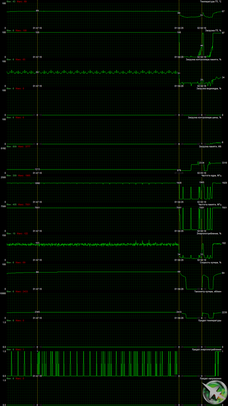 После 6-часового прогона под нагрузкой максимальная температура ядра не превысила 69 градусов, что является хорошим результатом для видеокарты такого уровня.