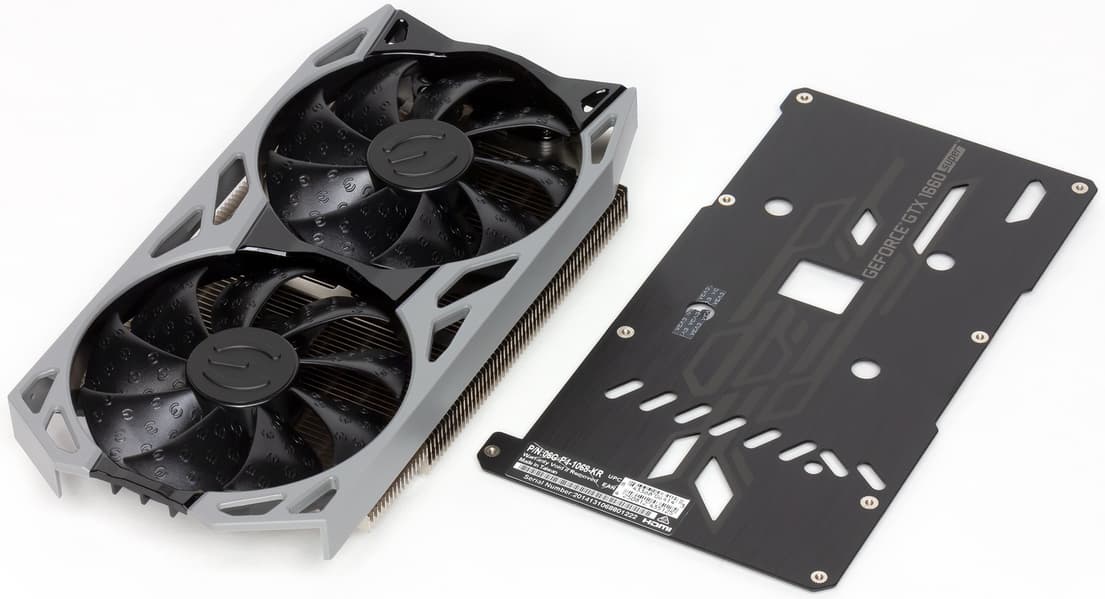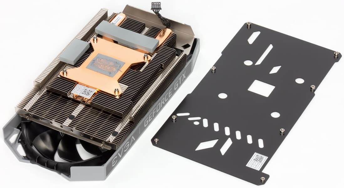 Основным элементом СО является относительно небольшой пластинчатый никелированный радиатор. Его пересекают всего две тепловые трубки — точно такую же СО мы видели у карты EVGA на основе GeForce RTX 2060, и уже тогда показалось, что эта СО достаточна для GTX 1660, но не для RTX 2060. На радиаторе имеется медная подошва, прижимающаяся к GPU. Микросхемы памяти охлаждаются тем же радиатором через термоинтерфейс, а вот силовые преобразователи оставлены без охлаждения. На обороте карты установлена толстая пластина, служащая только элементом жесткости.