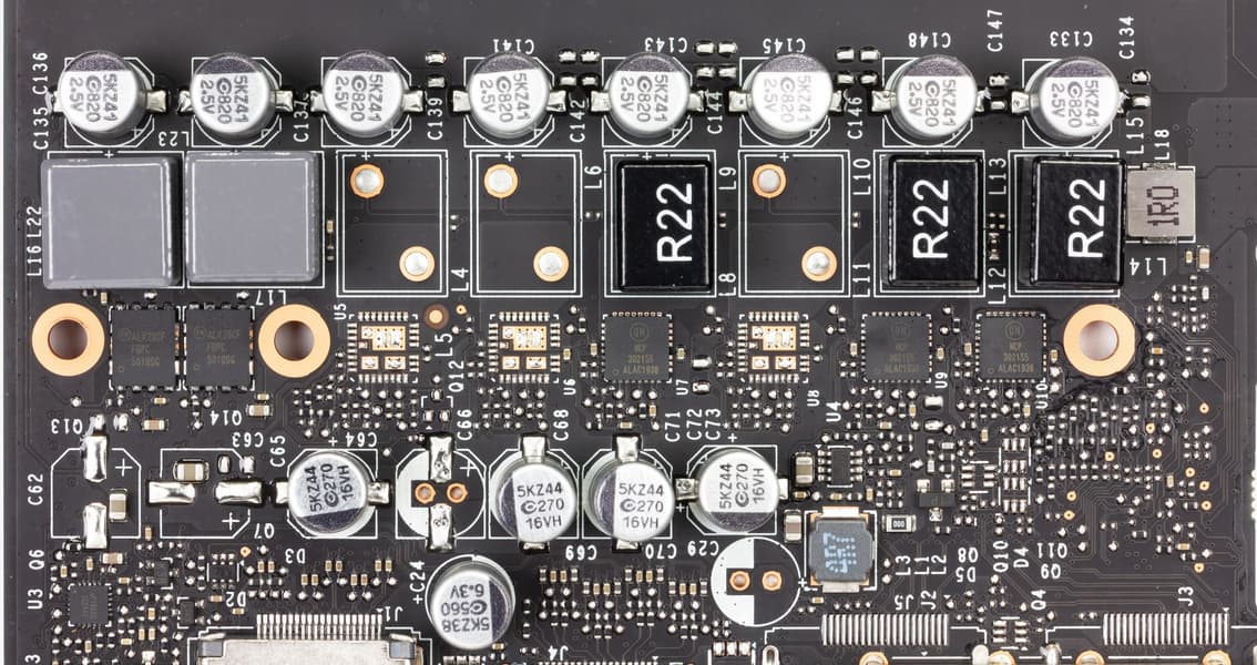Схема питания ядра 3-фазная (у бюджетной карты MSI — и то 4 фазы). PCB явно рассчитана на 6 фаз, и вообще она является копией печатной платы, которую мы не так давно изучали, тестируя EVGA GeForce RTX 2060. Выходит, мы были правы, предположив, что это универсальная PCB, которая может быть использована для производства разных видеокарт, и даже с разными GPU (благо последнее поколение графических процессоров Nvidia среднего уровня по контактным площадкам полностью идентично).