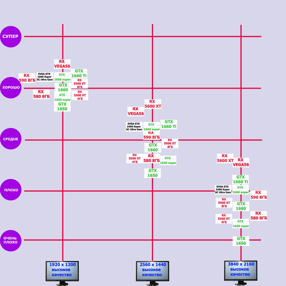 Многочисленные тесты показывают, что в целом GeForce GTX 1660 Super (как и его чуть более быстрый собрат GTX 1660 Ti) хорошо подойдет для игры в разрешении Full HD (1920×1200/1080) при выставлении максимальных настроек качества графики, но не более (хотя в некоторые простые по графике игры он позволит поиграть и в разрешении 2.5К). Если сравнивать с конкурентами из стана AMD, то по производительности GTX 1660 Super «обитает» где-то посредине между Radeon RX 5600 XT и RX 590.