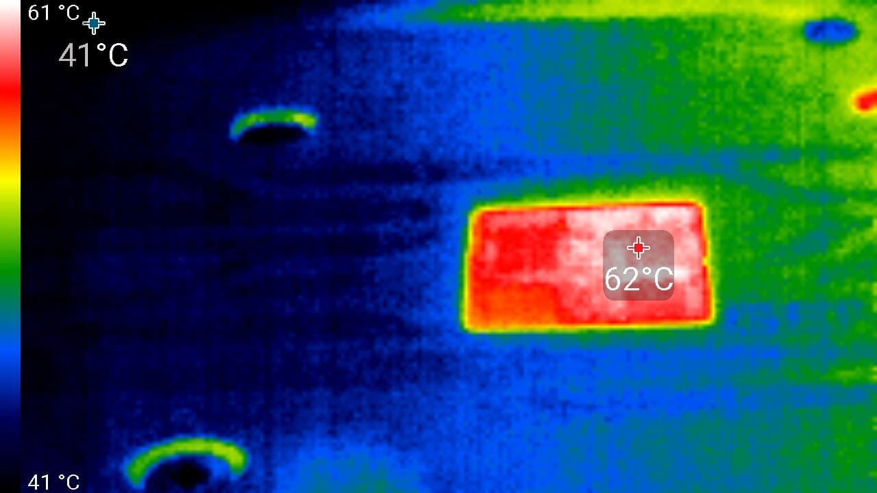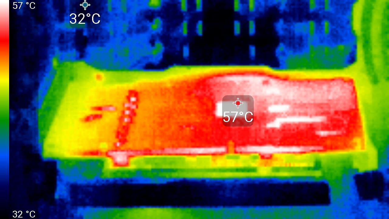 Максимальный нагрев — край платы и центральный участок PCB около GPU и силовых преобразователей.
