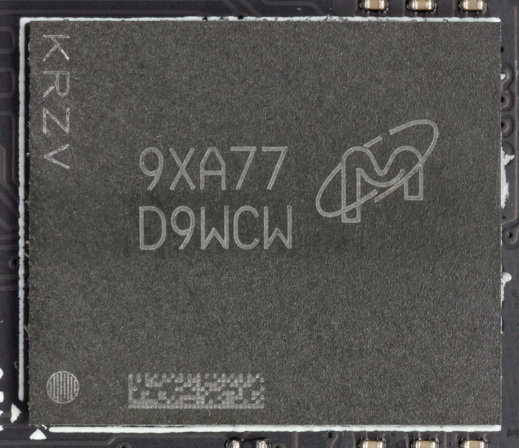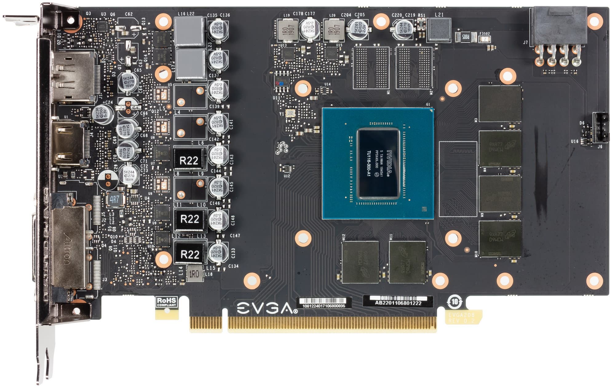 Карта имеет 6 ГБ памяти GDDR6 SDRAM, размещенной в 6 микросхемах по 8 Гбит на лицевой стороне PCB. Микросхемы памяти Micron (GDDR6, MT61K256M32JE-14) рассчитаны на номинальную частоту работы в 3500 (14000) МГц. Расшифровщик кодов на упаковках FBGA находится здесь.