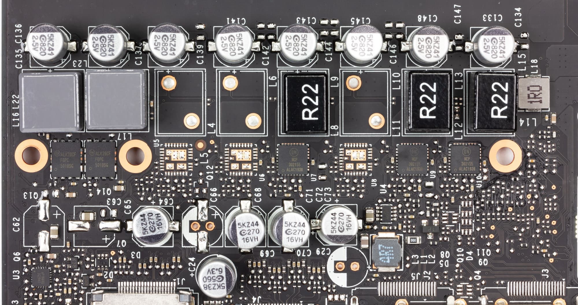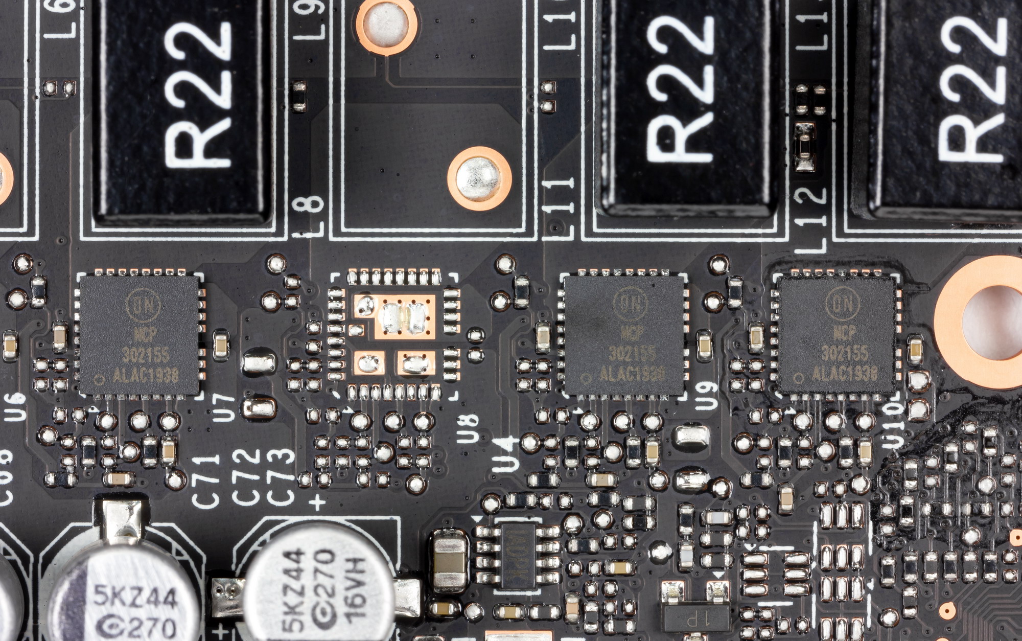 И еще 2 фазы — на микросхемы памяти. Используются хорошо известные транзисторные сборки DrMOS компании On Semiconductor.