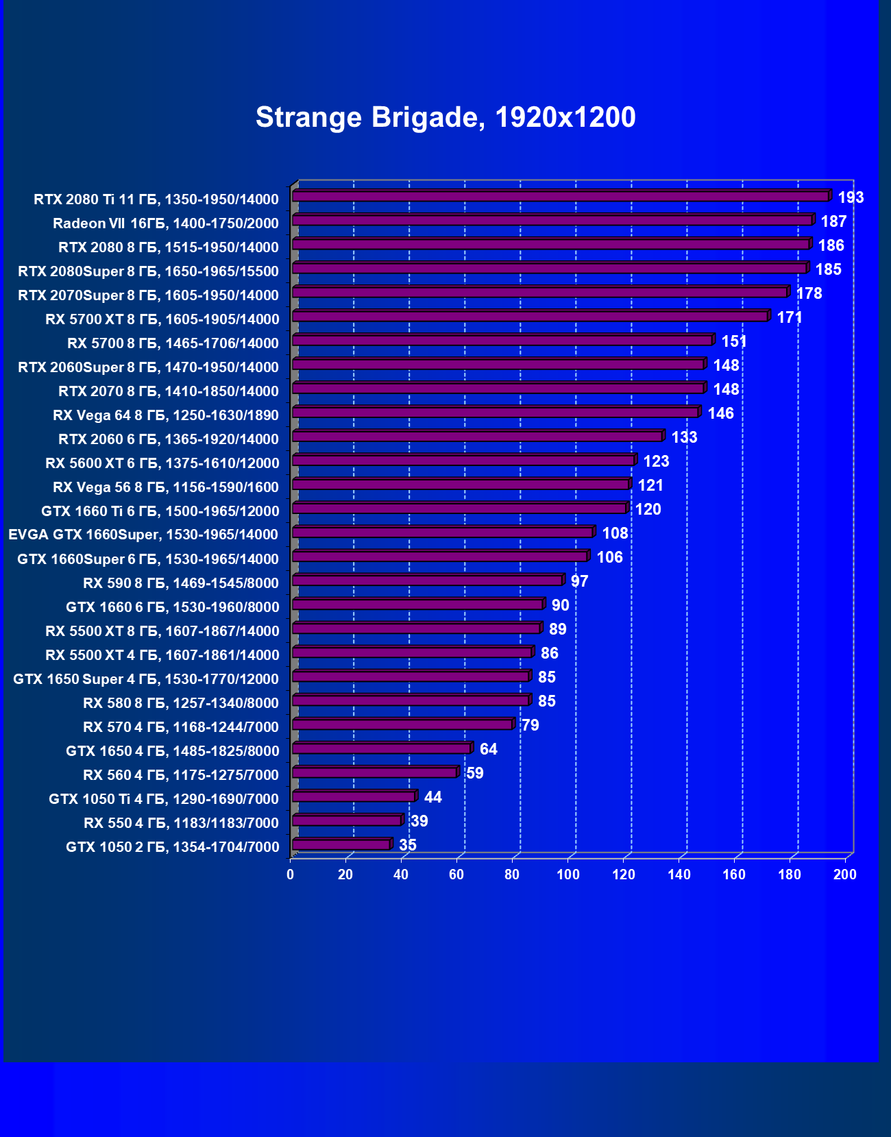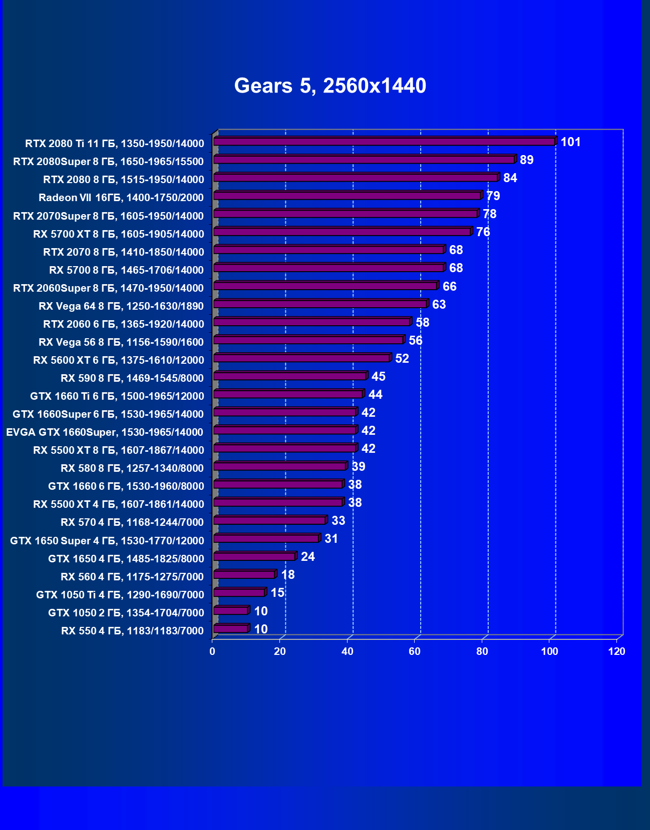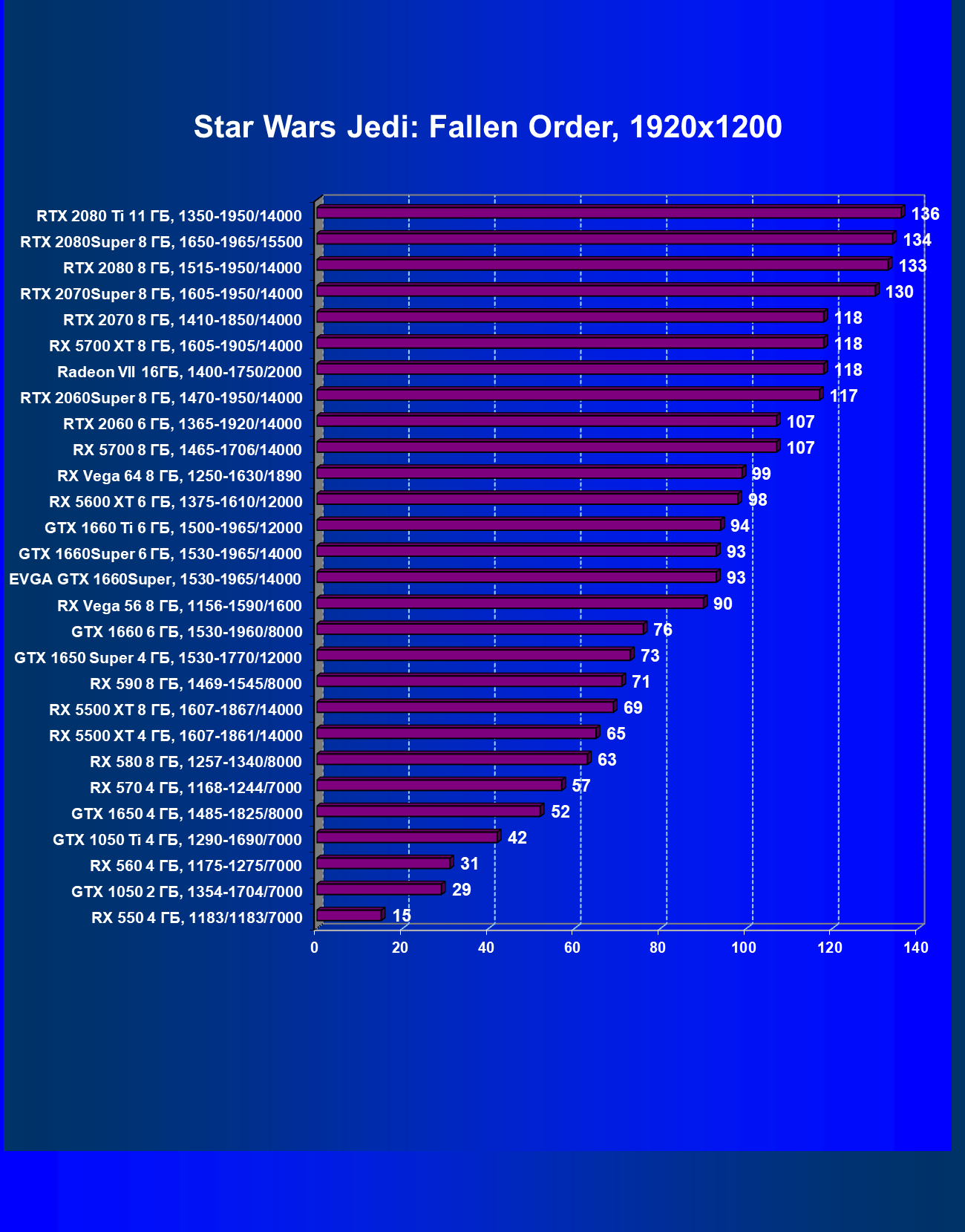 | 12 | RX 5500 XT 8 ГБ, 1607—1867/14000 | 388 | 570 | 14 700 |