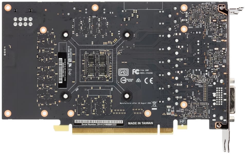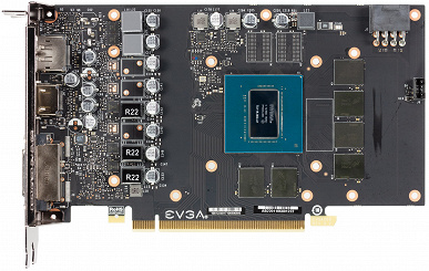 Набор видеовыходов у карты EVGA немного урезан: всего их три, а не четыре, как обычно, — по одному DisplayPort, HDMI и DVI. Питание подается через 8-контактный разъем.