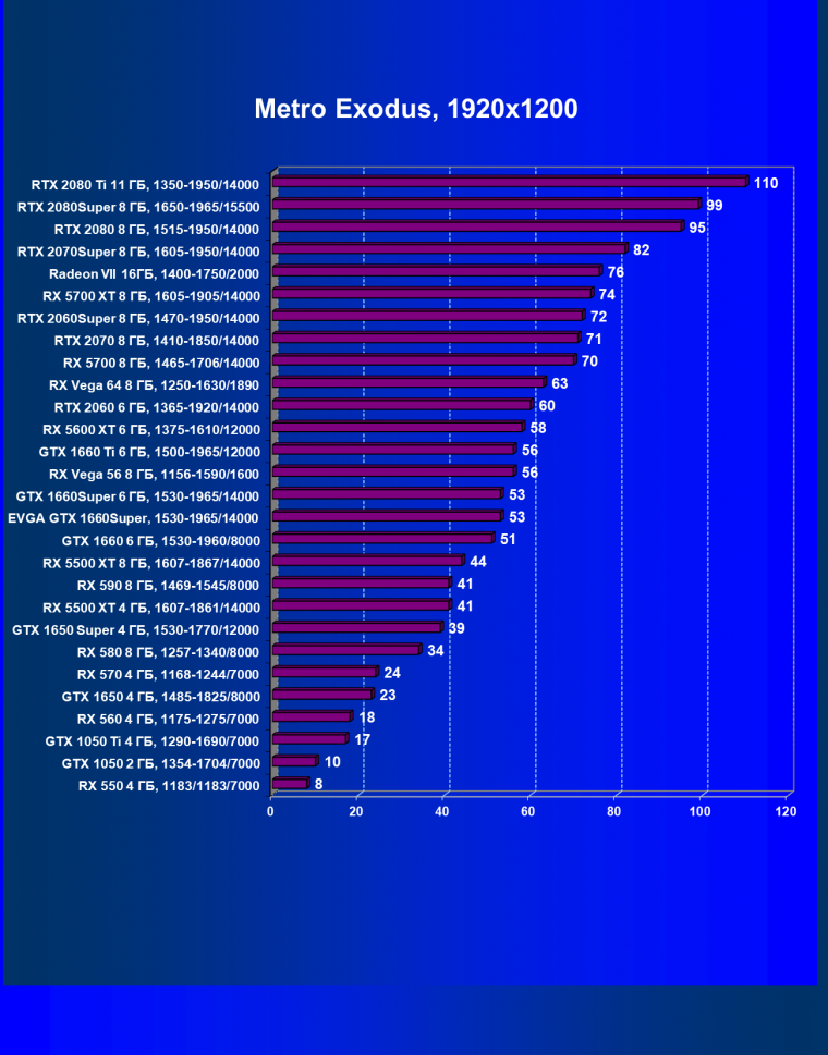 | 19 | RX 5500 XT 8 ГБ, 1607—1867/14000 | 570 | 388 | 14 700 |