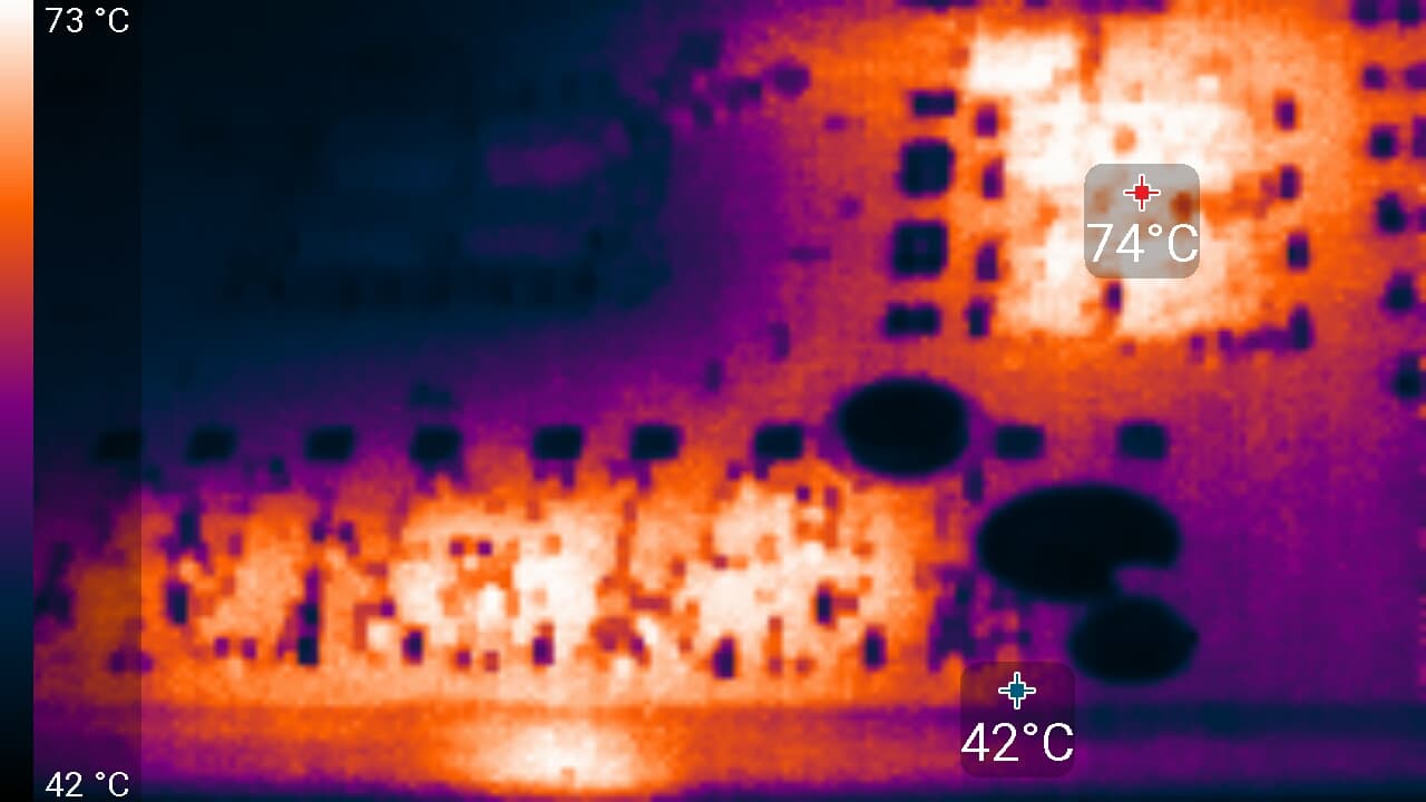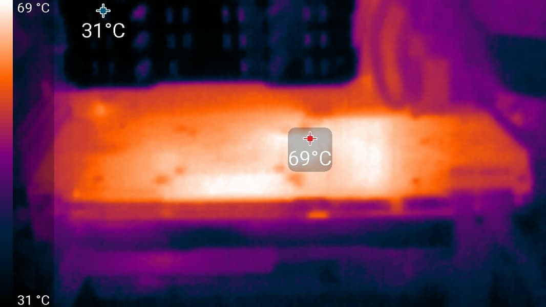 Максимальный нагрев — центральный участок PCB и район микросхем памяти.