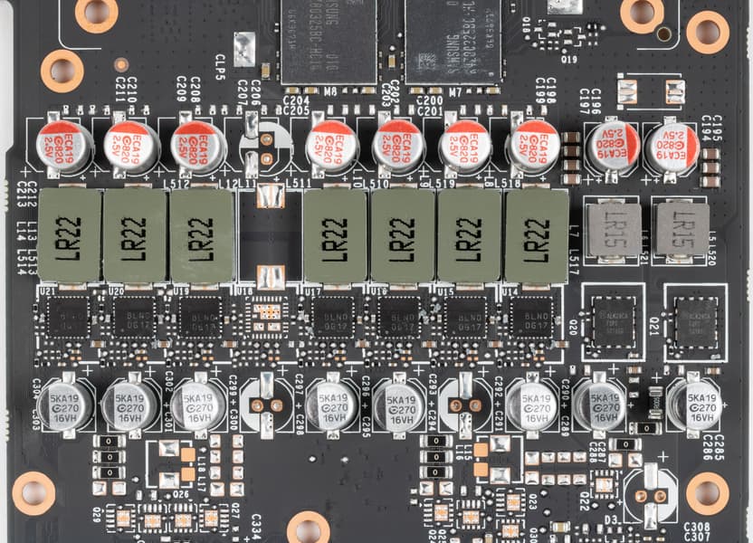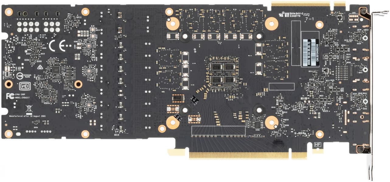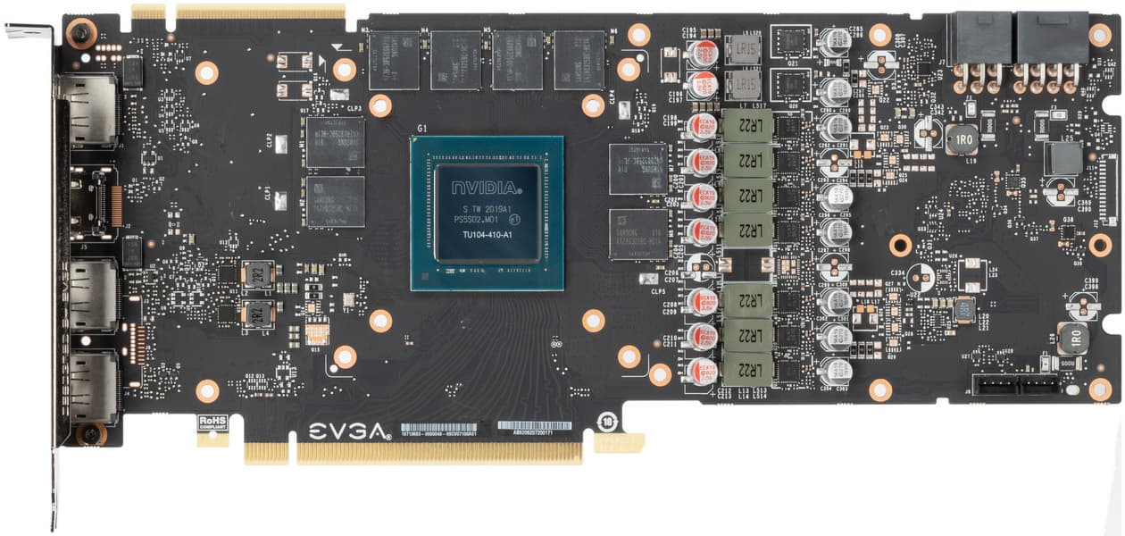 Карта Nvidia Founders Edition имеет 10-фазную схему питания (8 фаз на ядро, 2 фазы на микросхемы памяти), а у карты EVGA схема чуть-чуть проще: 7 фаз на GPU, хотя потенциально могло бы быть и 8 (просто печатная плата использована от RTX 2080, где использованы все 8 фаз).