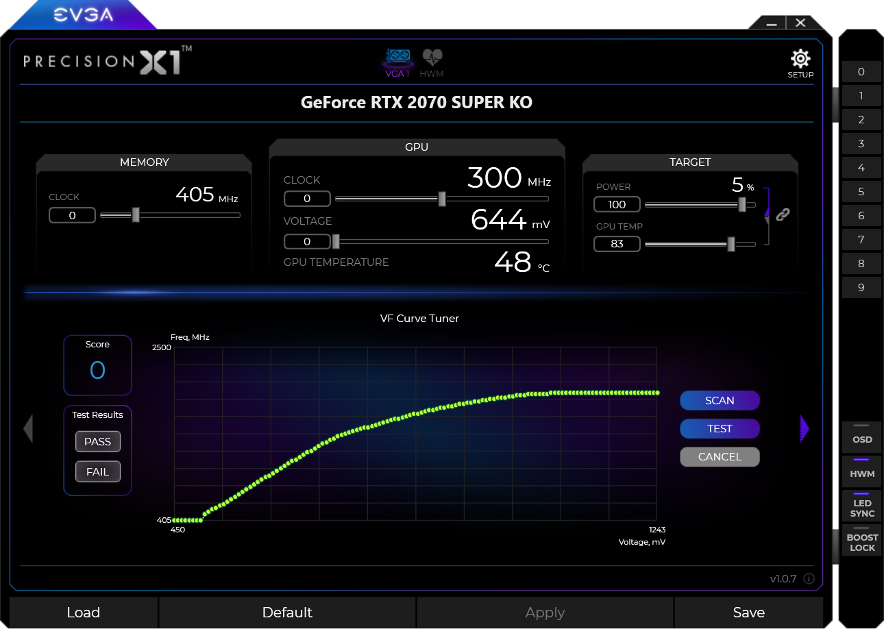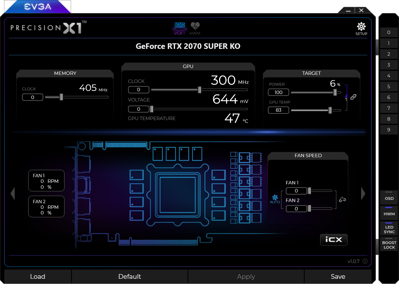 EVGA GeForce RTX 2070 Super KO Gaming (8 ГБ) — относительно компактный (со стандартными размерами для двухслотовой видеокарты), но весьма мощный вариант современного ускорителя с поддержкой всех современных технологий из ценовой ниши около 40-50 тысяч рублей. У карты нет подсветки, однако есть неплохой разгонный потенциал (к прискорбию, политика Nvidia не позволяет его реализовать в полной мере). Заметный минус — относительно шумная СО, обеспечивающая при этом по умолчанию даже несколько избыточное охлаждение (нагрев ядра не выше 60 °C). Мы рекомендуем через фирменную утилиту настроить работу вентиляторов по-своему, позволить ядру греться, скажем, до 75 градусов за счет сниженного шума, такое сочетание выглядит идеально. Настройка СО по умолчанию нам не очень понятна. К слову, сама утилита EVGA Precision X1 оставила очень приятное впечатление.