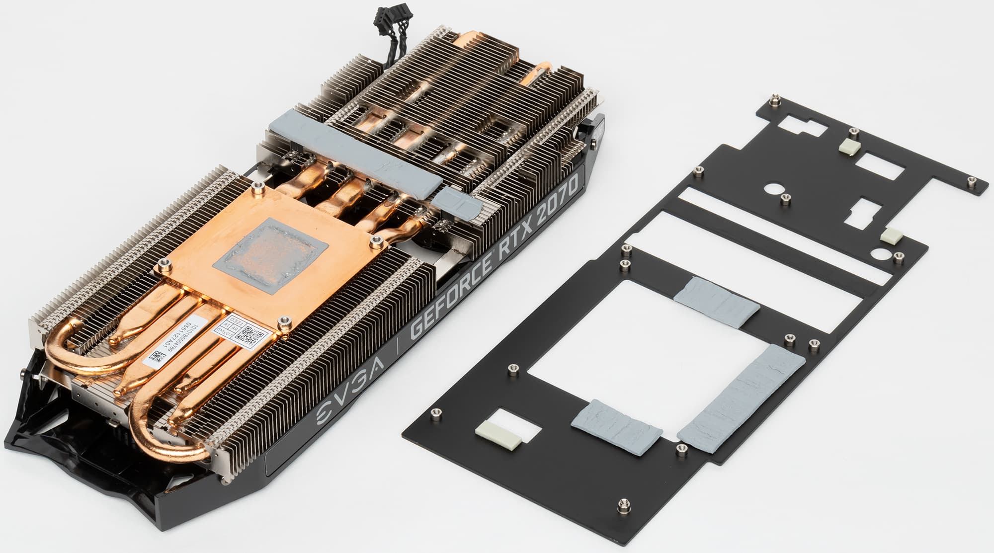 Как во многих СО топового уровня, основным элементом является сдвоенный пластинчатый радиатор, покрытый никелем. Обе части радиатора имеют много тонких ребер, которые пронизаны несколькими тепловыми трубками. Микросхемы памяти через термоинтерфейс охлаждаются специальной пластиной, прикрученной к радиатору. А силовые элементы имеют свою подошву охлаждения на второй части радиатора.