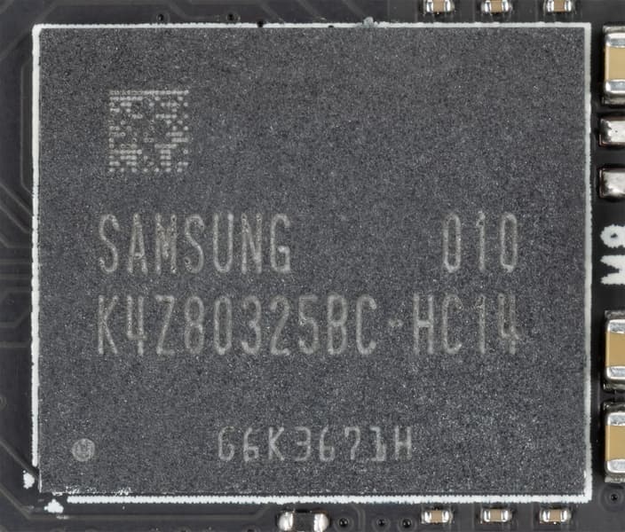 Карта имеет 8 ГБ памяти GDDR6 SDRAM, размещенной в 8 микросхемах по 8 Гбит на лицевой стороне PCB. Микросхемы памяти Samsung (GDDR6) рассчитаны на номинальную частоту работы в 3500 (14000) МГц
