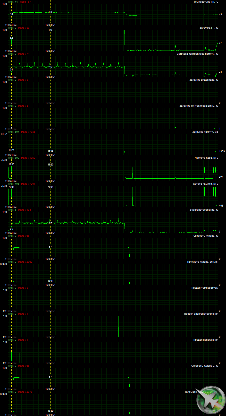 В режиме максимальной нагрузки в 3D (без ручного разгона) температура достигала 60 °C. Вентиляторы при этом раскручивались до 2000 оборотов в минуту, шум вырастал до 33,6 дБА, это не очень громко, но отчетливо слышно. Видеоролик ниже наглядно демонстрирует работу карты под нагрузкой.