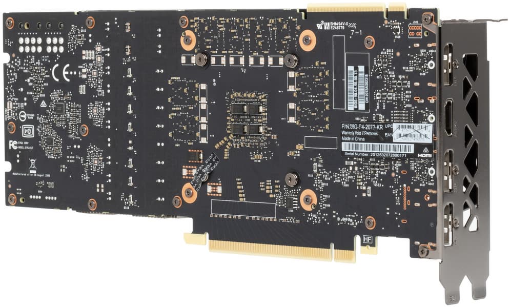Набор видеовыходов у карты EVGA обычный: три DisplayPort и один HDMI. Питание подается через два разъема: 8-контактный и 6-контактный.