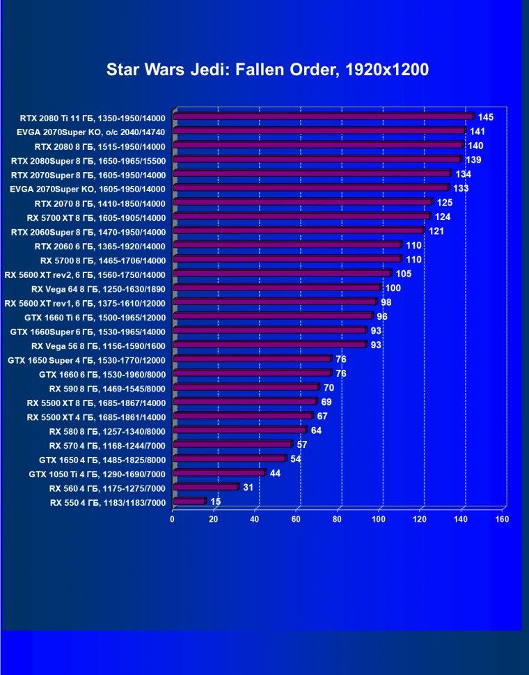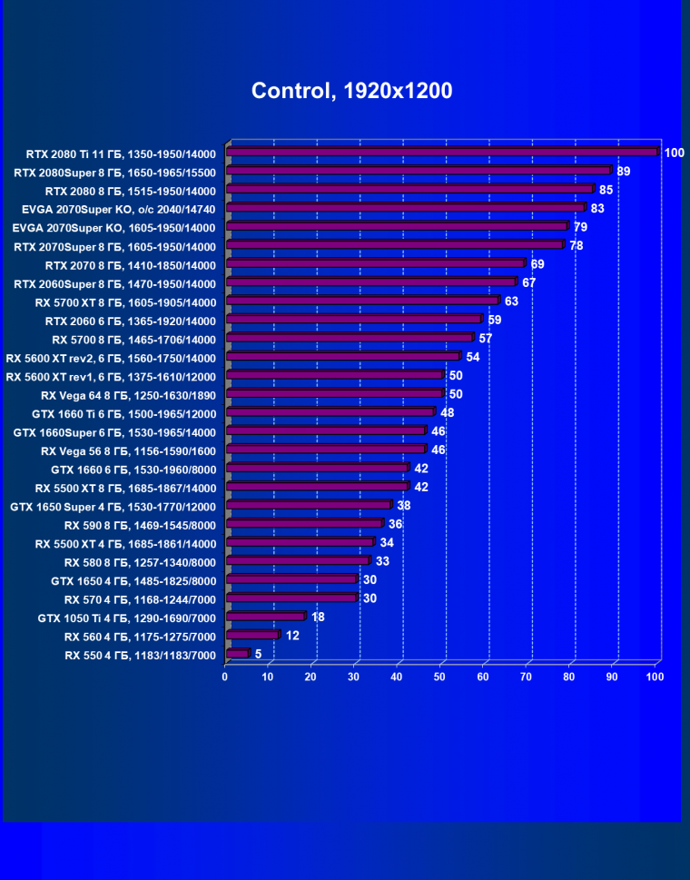 Рейтинг ускорителей iXBT.com демонстрирует нам функциональность видеокарт друг относительно друга и нормирован по самому слабому ускорителю — Radeon RX 550 (то есть сочетание скорости и функций RX 550 приняты за 100%). Рейтинги ведутся по 28 ежемесячно исследуемым нами акселераторам в рамках проекта Лучшая видеокарта месяца. Из общего списка выбирается группа карт для анализа, куда входят RTX 2070 Super и его конкуренты.
