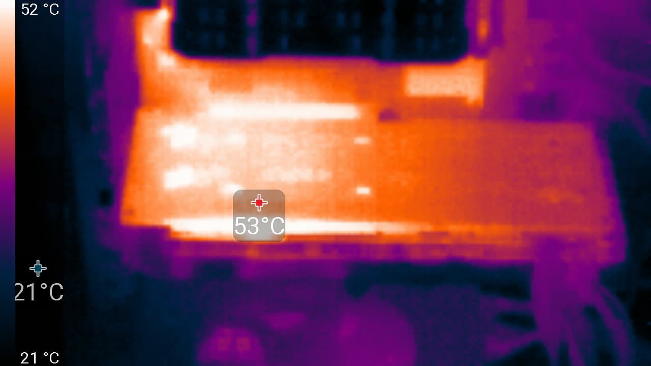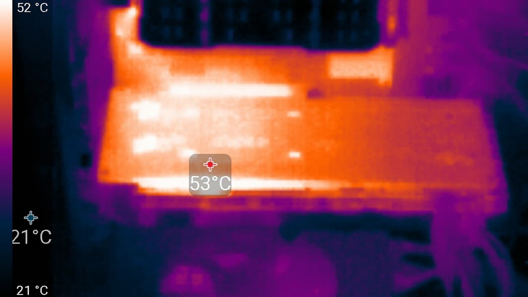 Максимальный нагрев наблюдался в центральной части PCB, в основном около ядра.