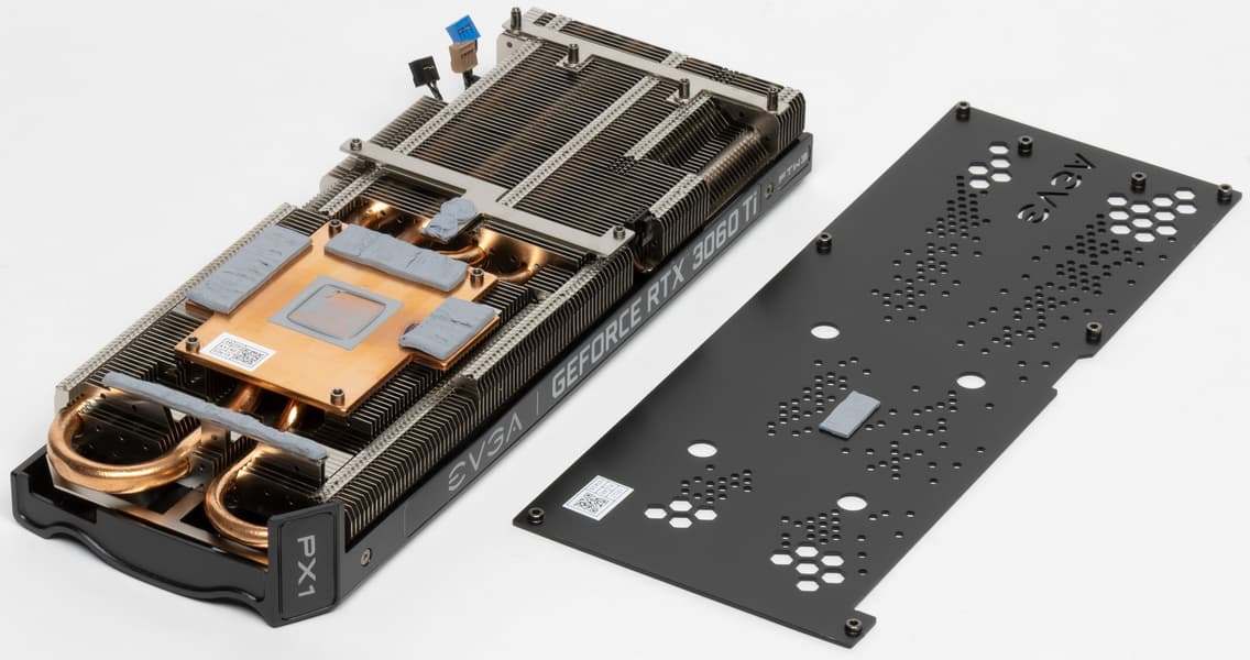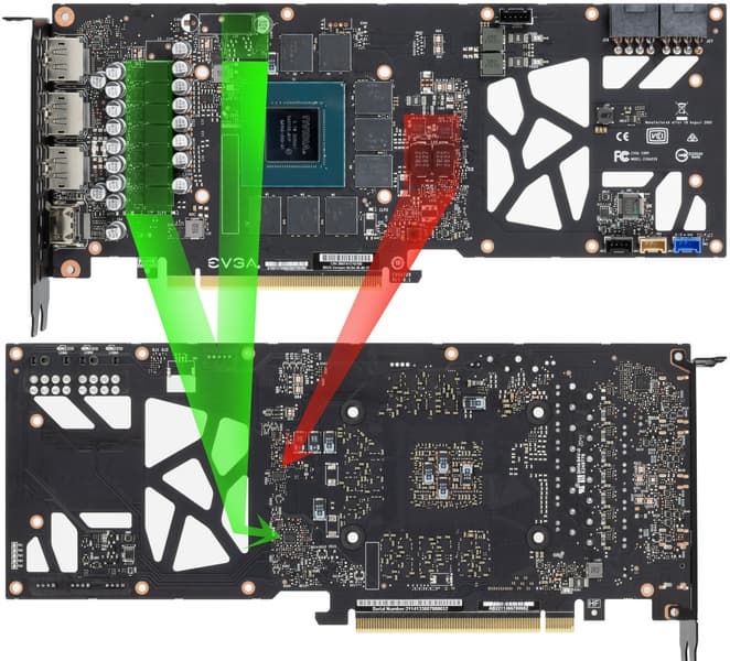 Суммарное количество фаз питания у Nvidia GeForce RTX 3060 Ti Founders Edition — 10: 8 фаз на ядро и 2 на микросхемы памяти. У карты EVGA точно такая же раскладка фаз: 2 на память и 8 на GPU.