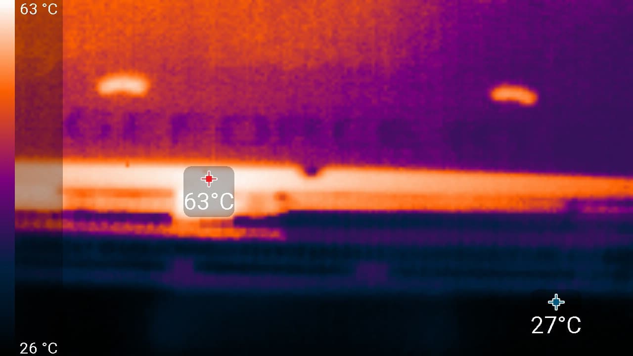 В простое температура была не выше 45 °C, вентиляторы не работали, уровень шума был равен фоновому — 18 дБА.