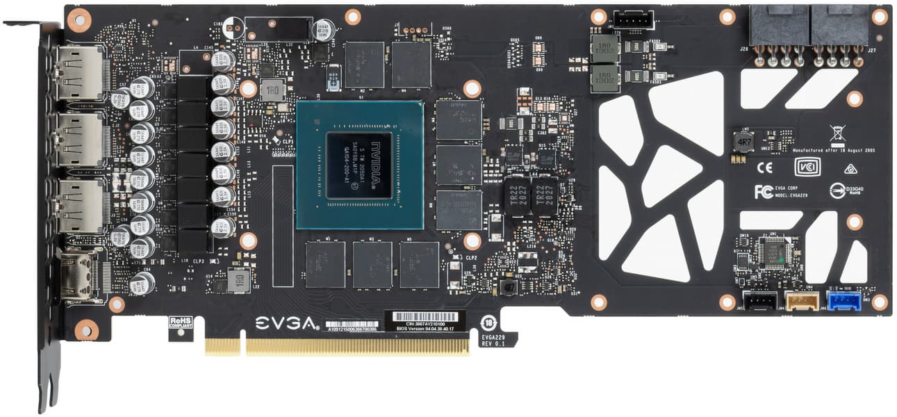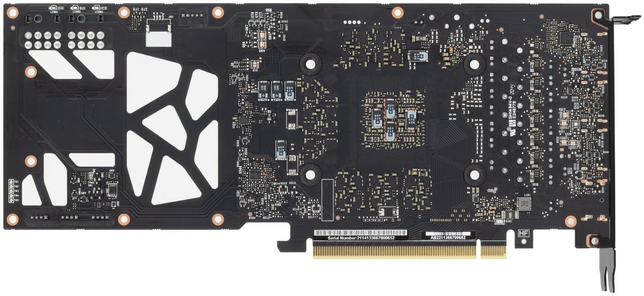 Задняя пластина выполнена из алюминия с электрозащитным покрытием и служит охладителем печатной платы, а также элементом защиты PCB. Идея сквозной продувки радиатора у данной видеокарты реализована чисто формально: в само́й печатной плате окно для продувки насквозь представляет собой лишь ряд невнятных отверстий.