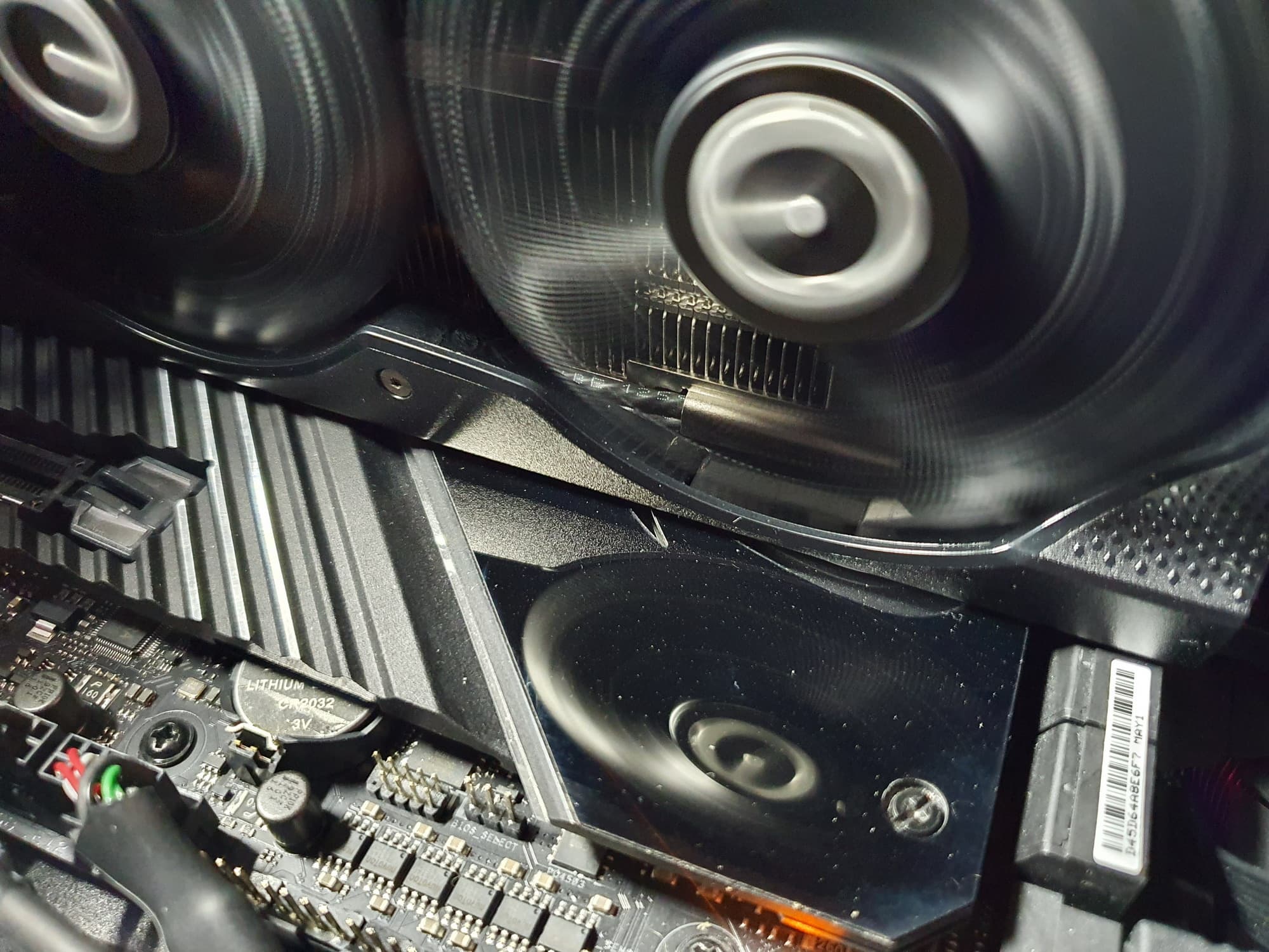 Система охлаждения привычная, ее основой является пластинчатый никелированный радиатор с тепловыми трубками, последние припаяны к медной подошве, которая снимает тепло не только с GPU, но и с микросхем памяти через термоинтерфейс (эта технология является частью фирменной СО — iCX3). Для преобразователей питания VRM имеются свои небольшие подошвы на том же радиаторе.