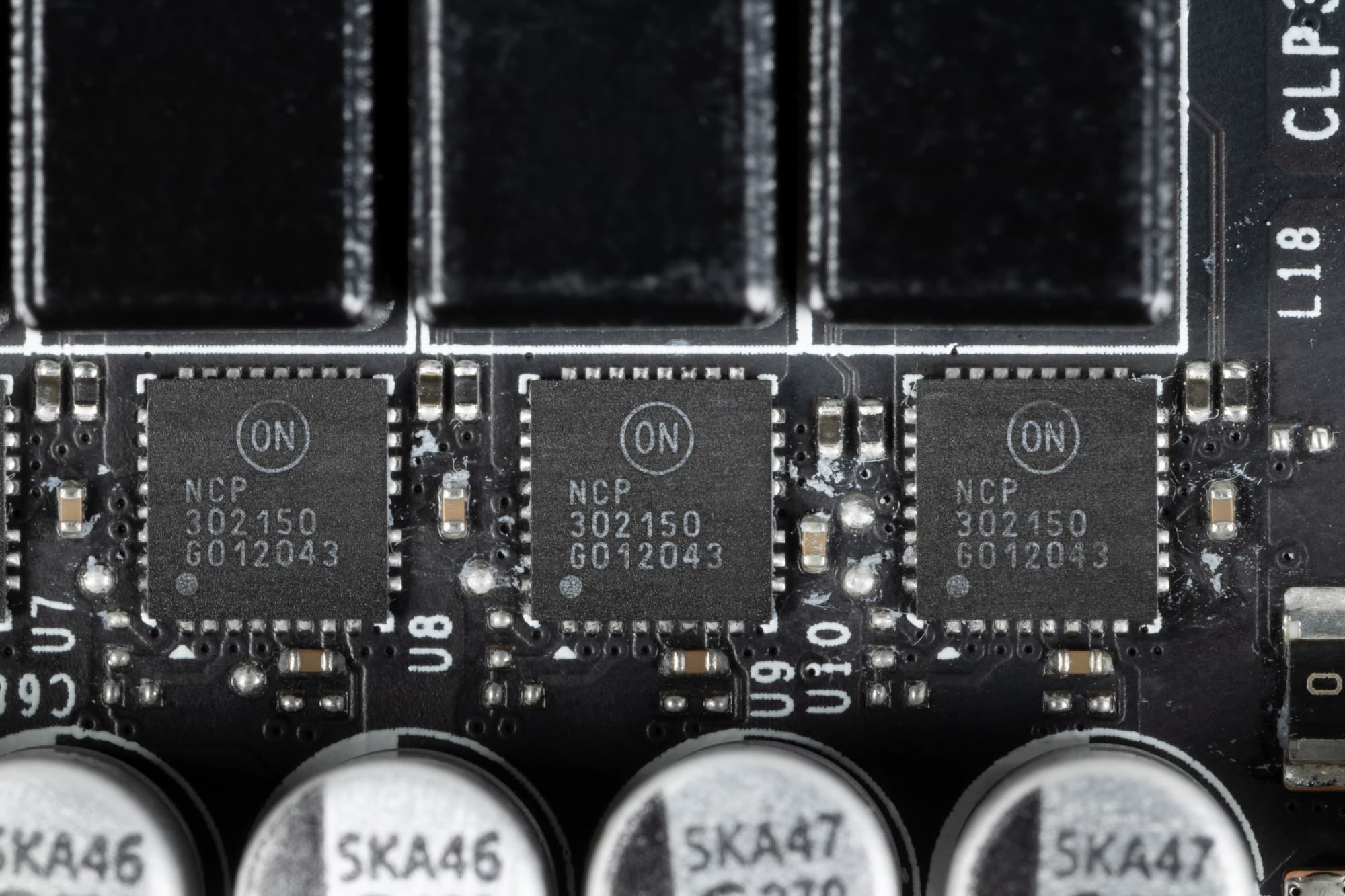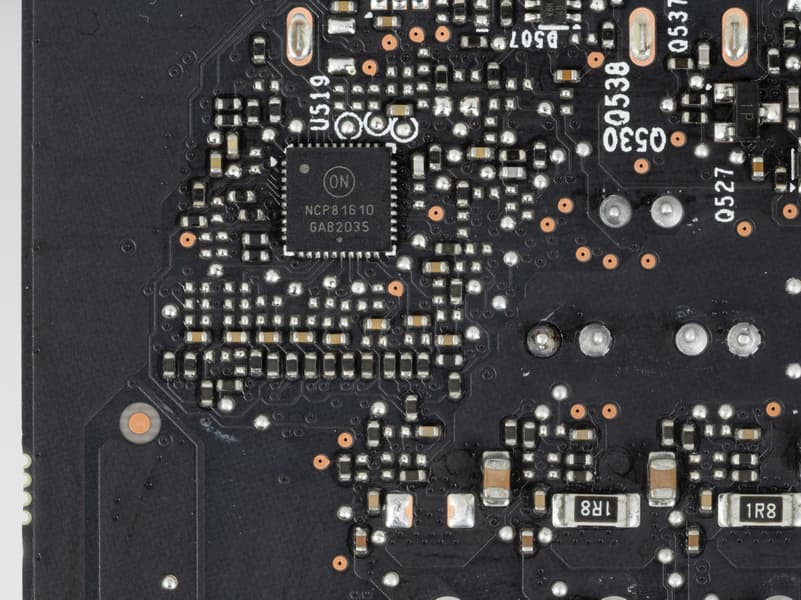 В преобразователе питания, традиционно для всех видеокарт Nvidia, используются транзисторные сборки DrMOS — в данном случае NCP302150 (On Semiconductor), каждая из которых рассчитана максимум на 50 А.