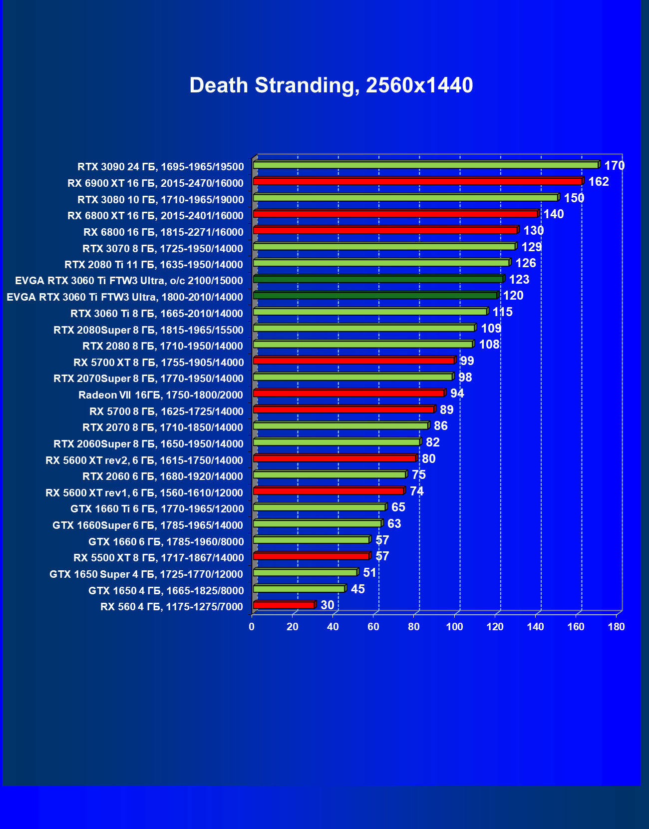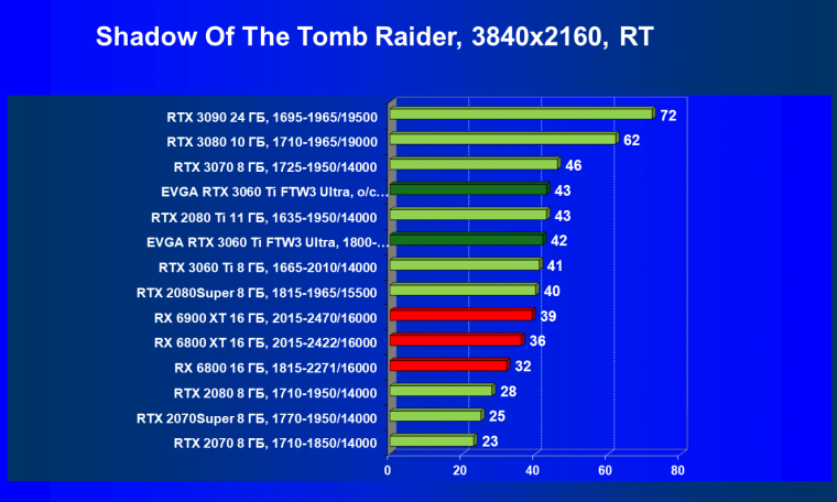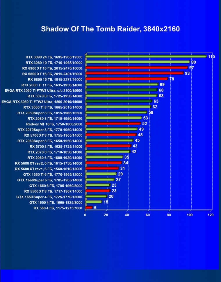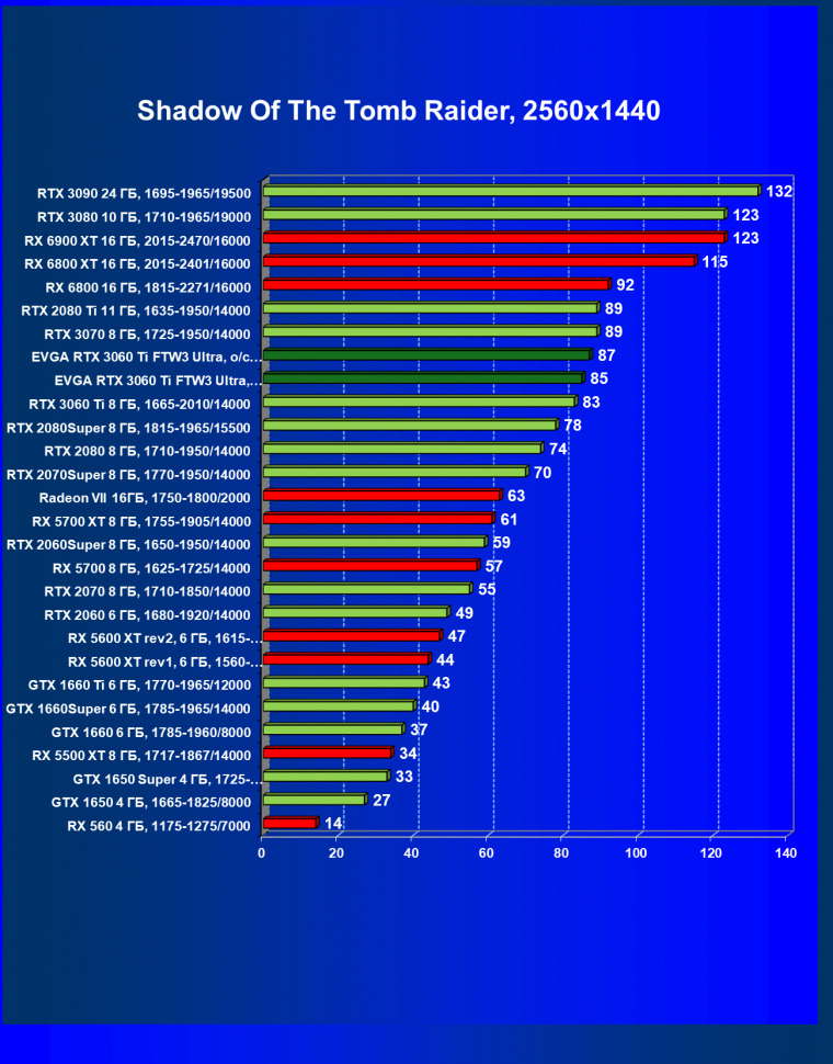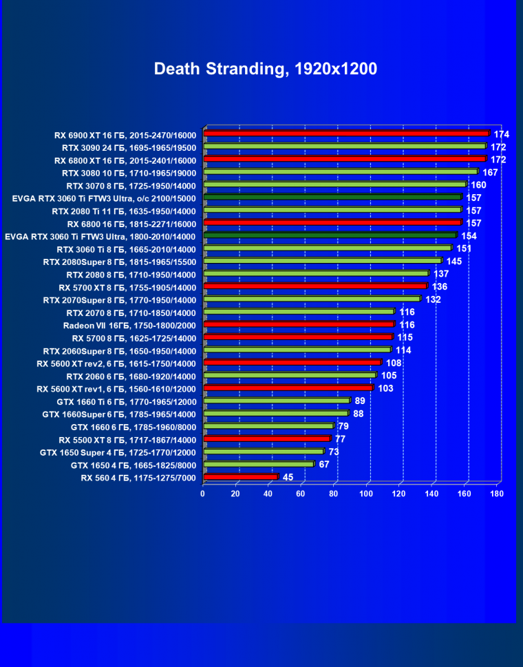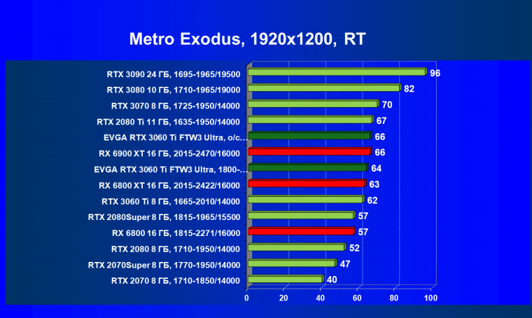 В целом соотношение сил среди видеокарт Nvidia осталось таким же, причем GeForce RTX 3060 Ti легко выиграл сражение даже у заведомо более дорогого Radeon RX 6800.