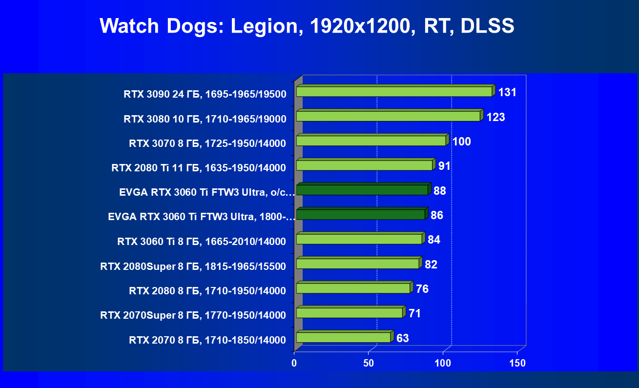 | 08 | EVGA RTX 3060 Ti FTW3 Ultra, 1800—2010/14000 | 150 | 15 | 98 000 |