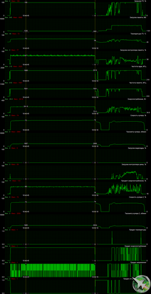 После 2-часового прогона под нагрузкой максимальная температура ядра не превысила 72 градусов, что является приемлемым результатом. Энергопотребление карты доходило до 241 Вт. Кулер при этом работал шумно.