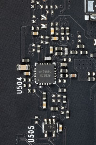 На той же стороне имеется ШИМ-контроллер uPI Semiconductor uP1666Q, который управляет 2-фазной схемой питания микросхем памяти.