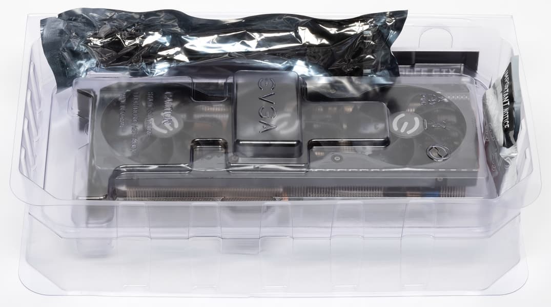 Кронштейна-подставки в комплекте у карты нет, однако есть специальная планка-брекет, которая привинчивается к задней пластине и крепит хвостовую часть карты к корпусу, если он это предусматривает (в первую очередь подразумеваются собственные корпуса EVGA, однако и у других фирм есть модели, предусматривающие крепление длинных видеокарт к перемещаемым планкам с отверстиями). Винты идут в комплекте с брекетом.