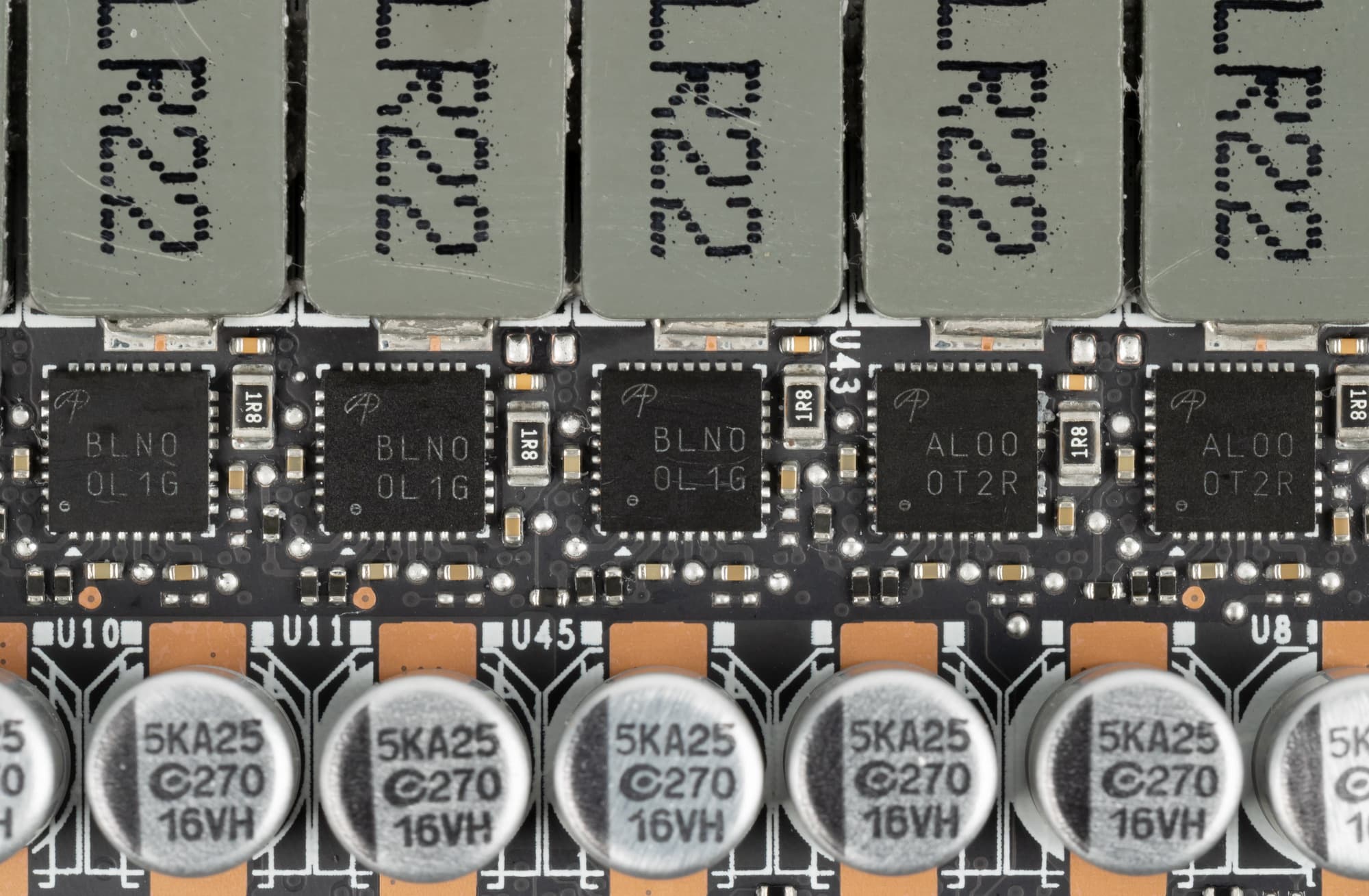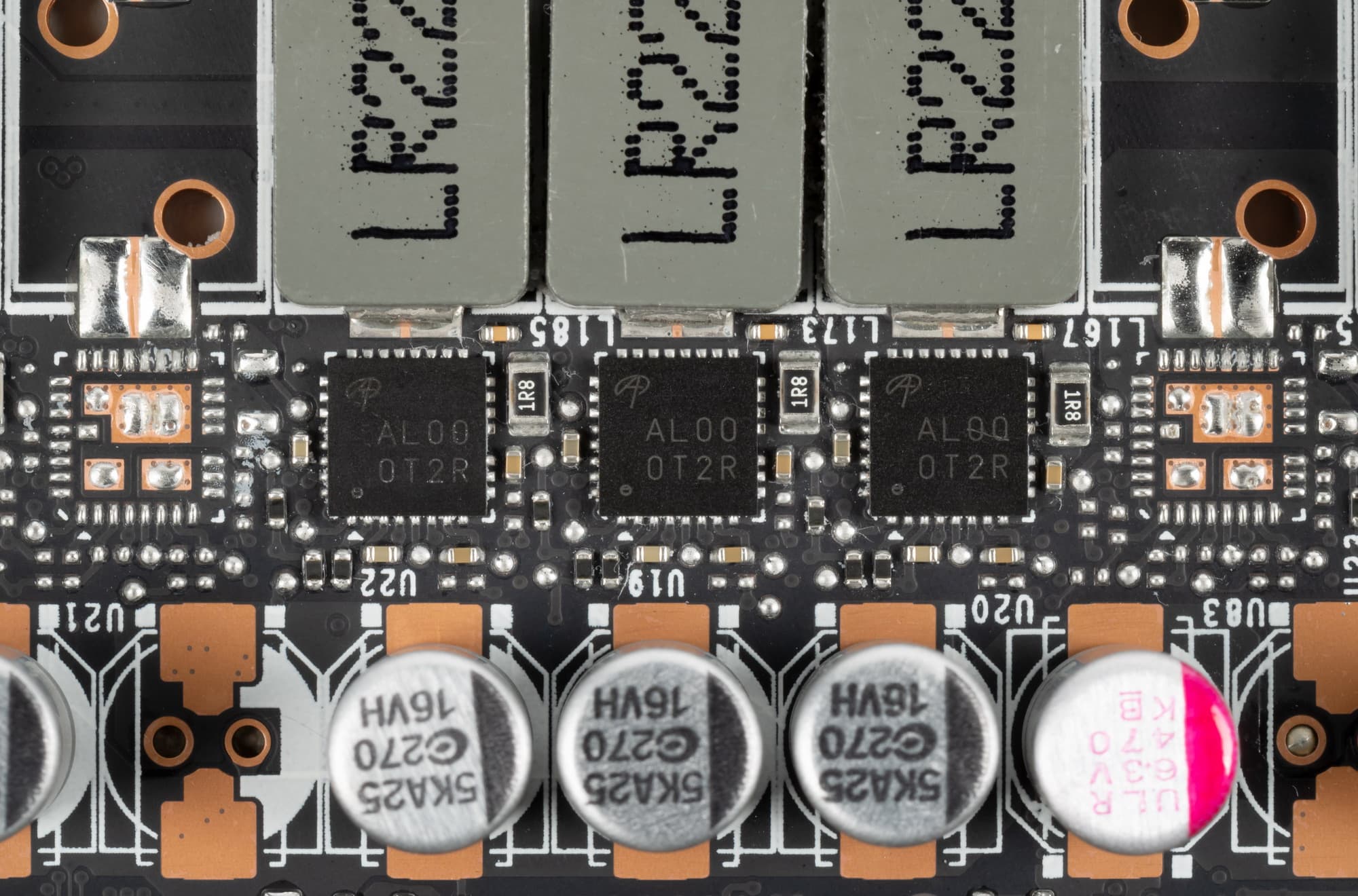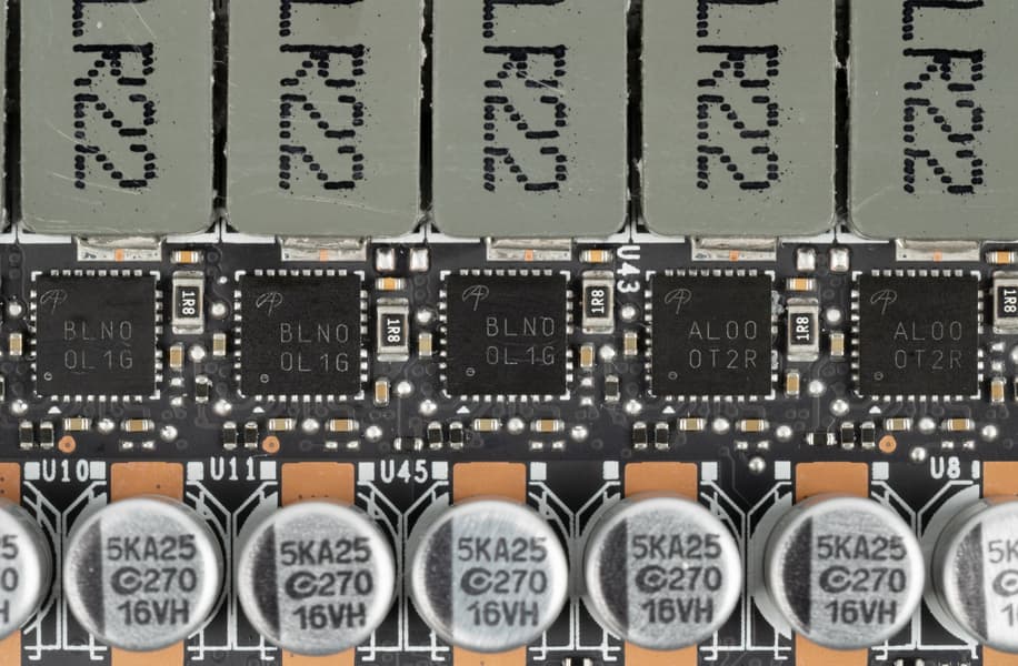 В преобразователе питания, традиционно для всех видеокарт Nvidia, используются транзисторные сборки DrMOS — в данном случае AOZ5332QI и AOX5311NGI (Alpha & Omega Semiconductor), каждая из которых рассчитана максимум на 50 А.