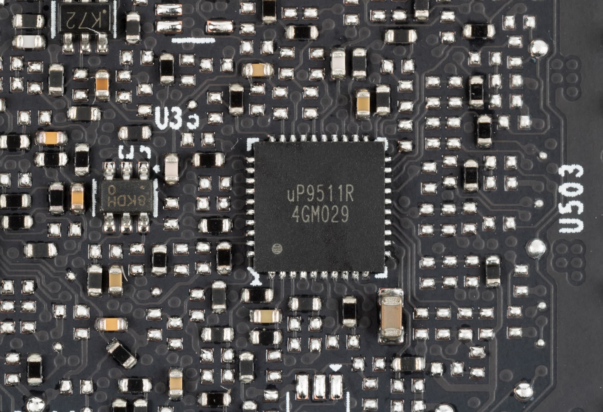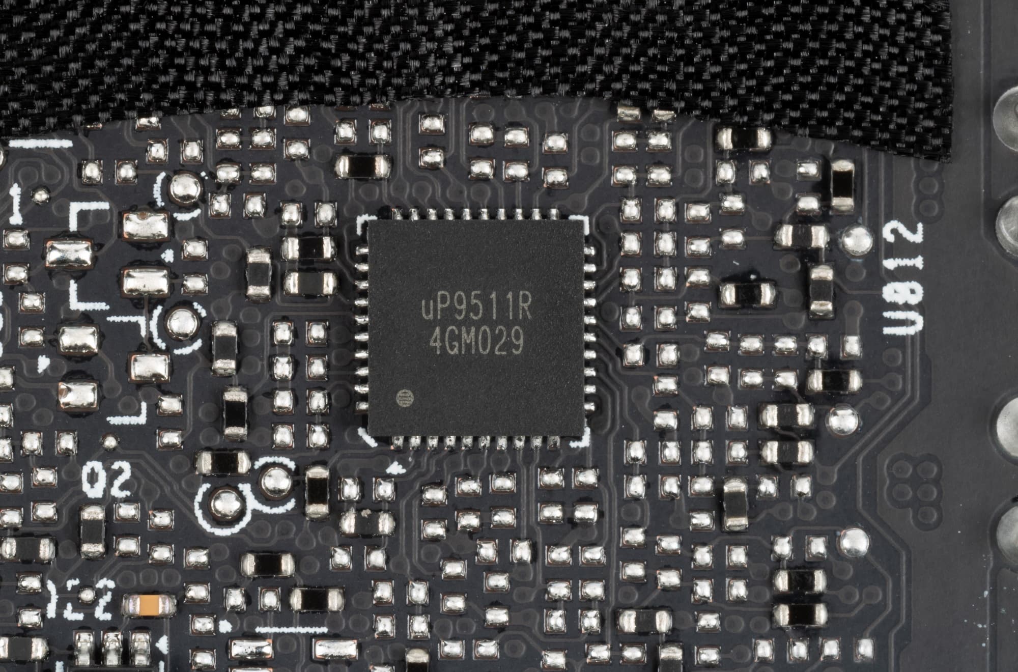 На лицевой же стороне имеется третий ШИМ-контроллер uPI Semiconductor uP9511R, который управляет 3-фазной схемой питания микросхем памяти.