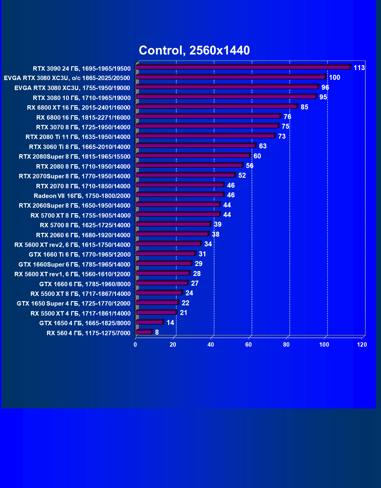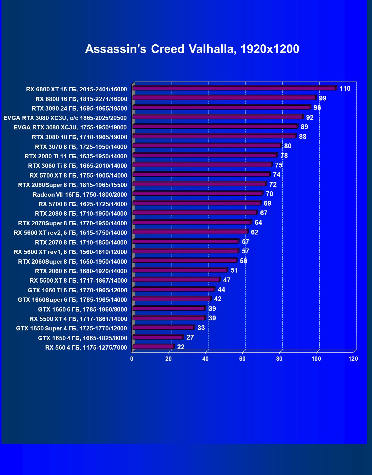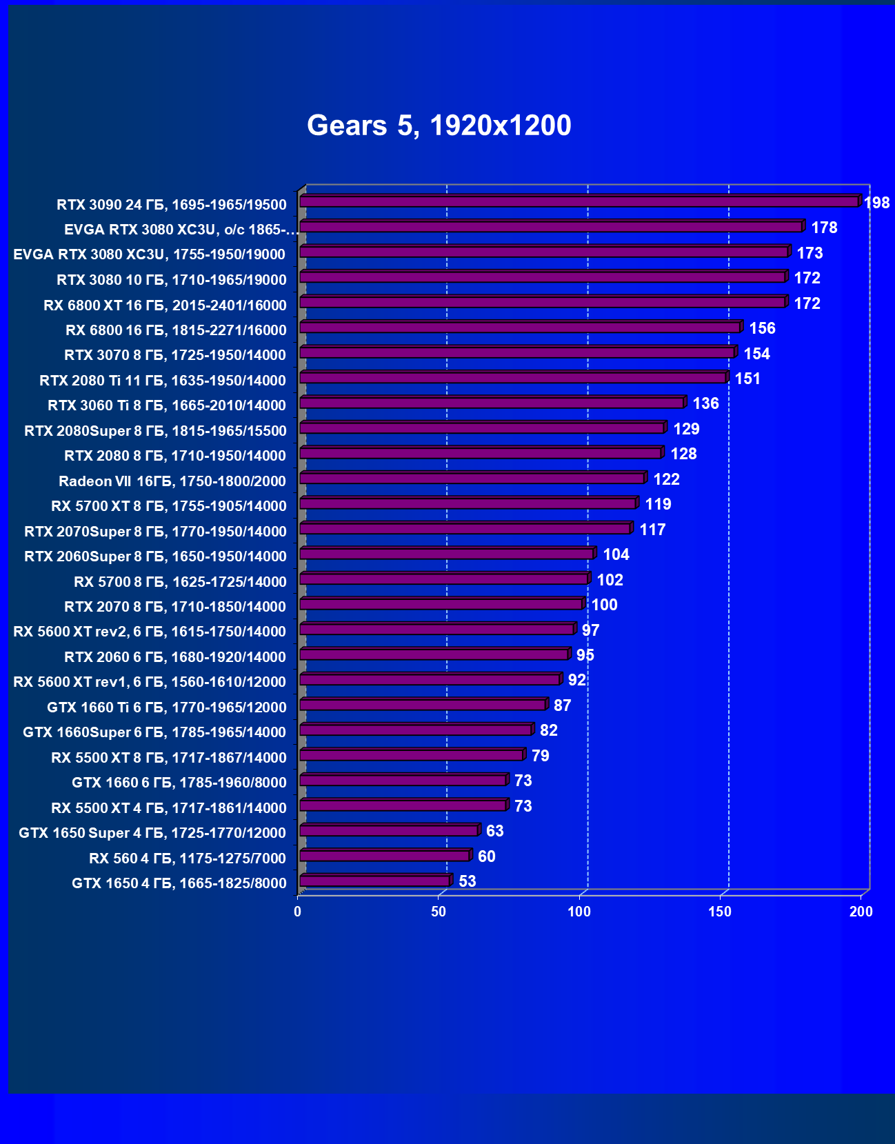 | 03 | EVGA RTX 3080 XC3U, разгон до 1865—2025/20500 | 28 | 237 | 86 000 |