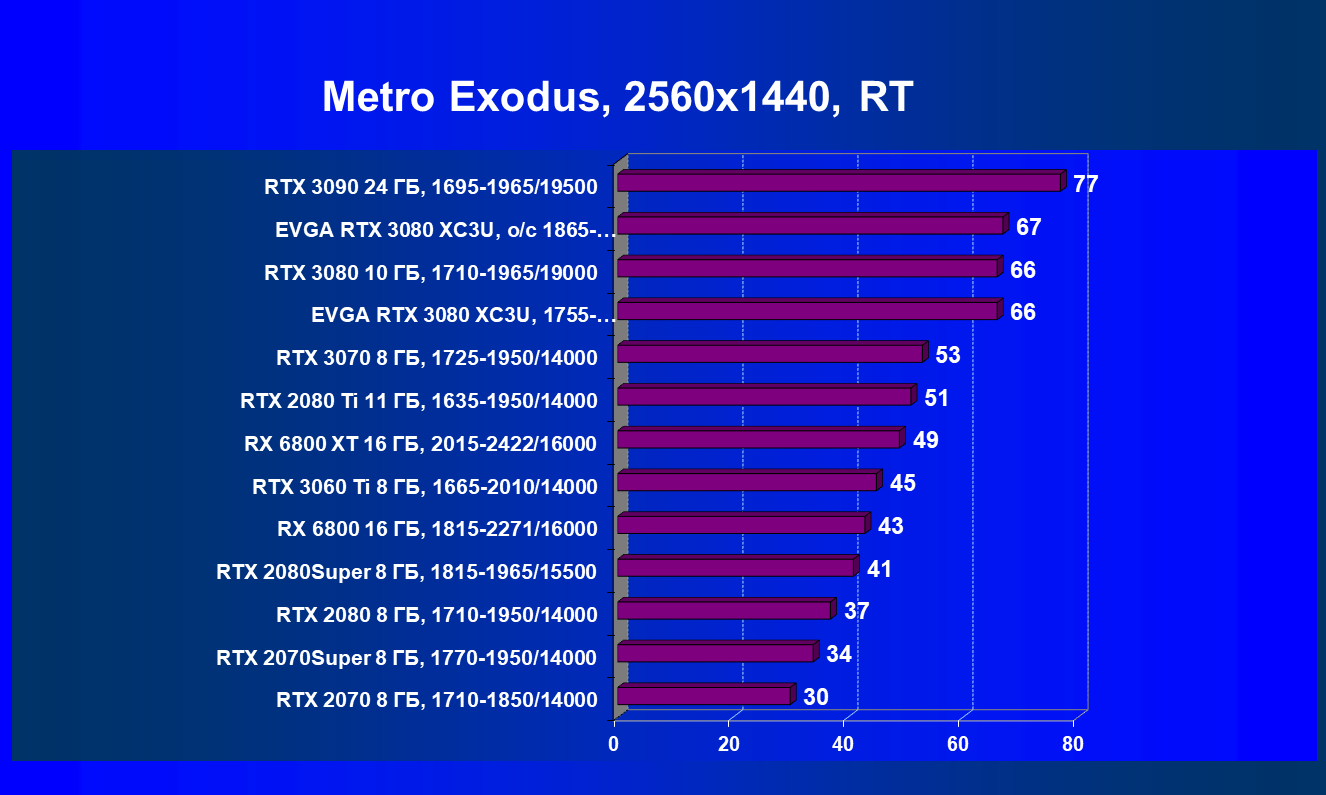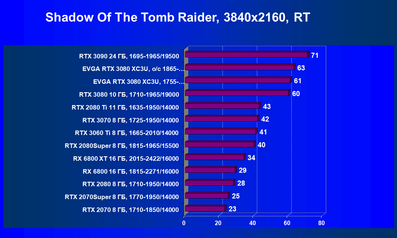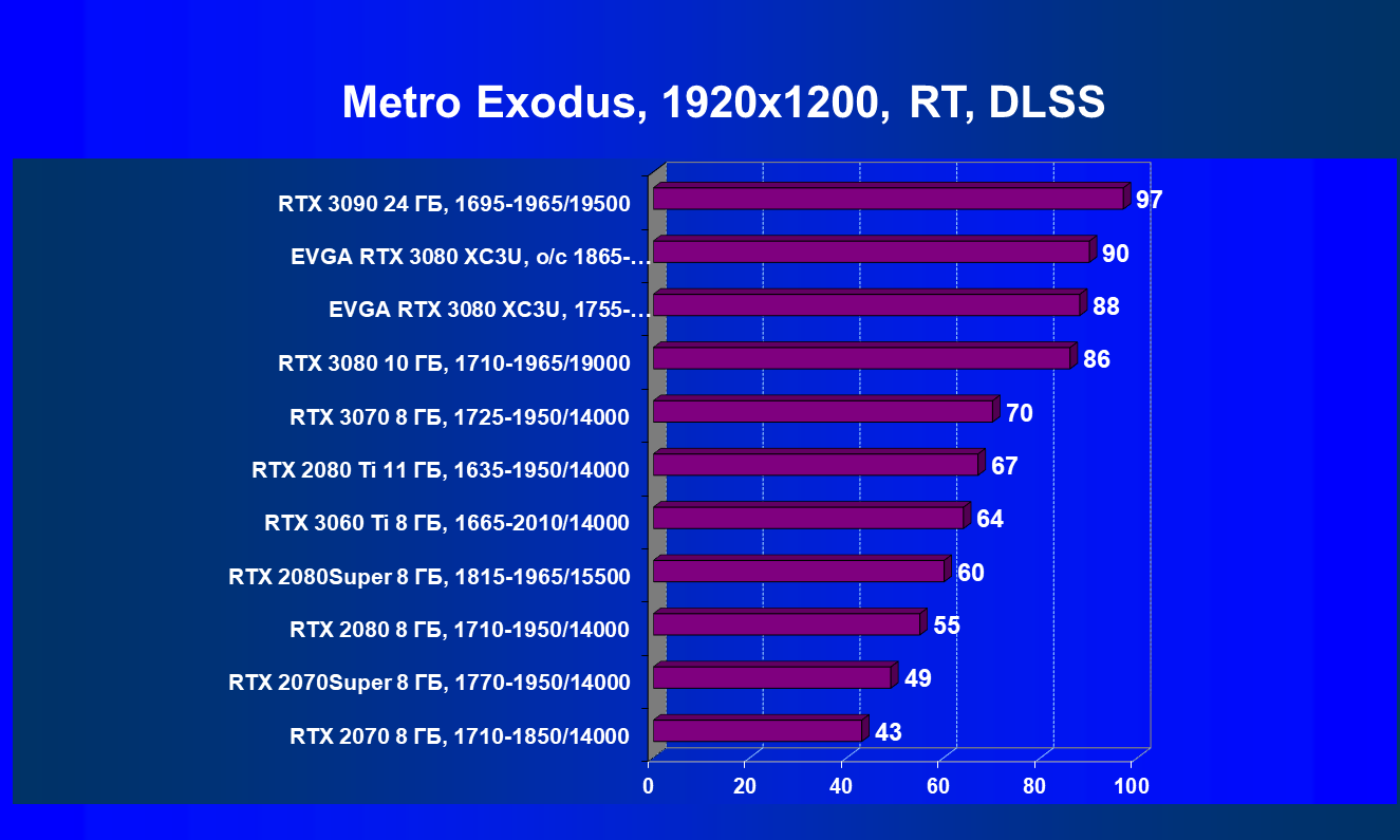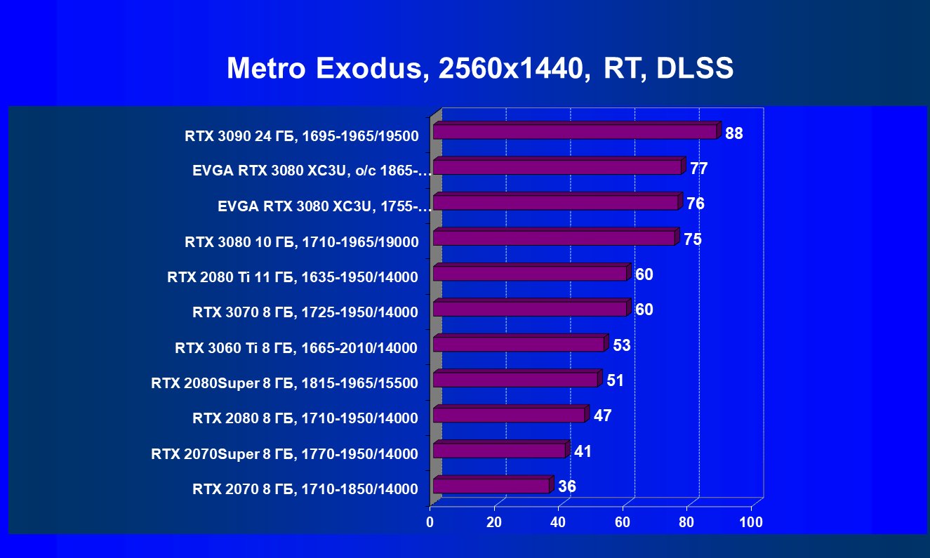 | 04 | EVGA RTX 3080 XC3U, разгон до 1865—2025/20500 | 278 | 2387 | 86 000 |