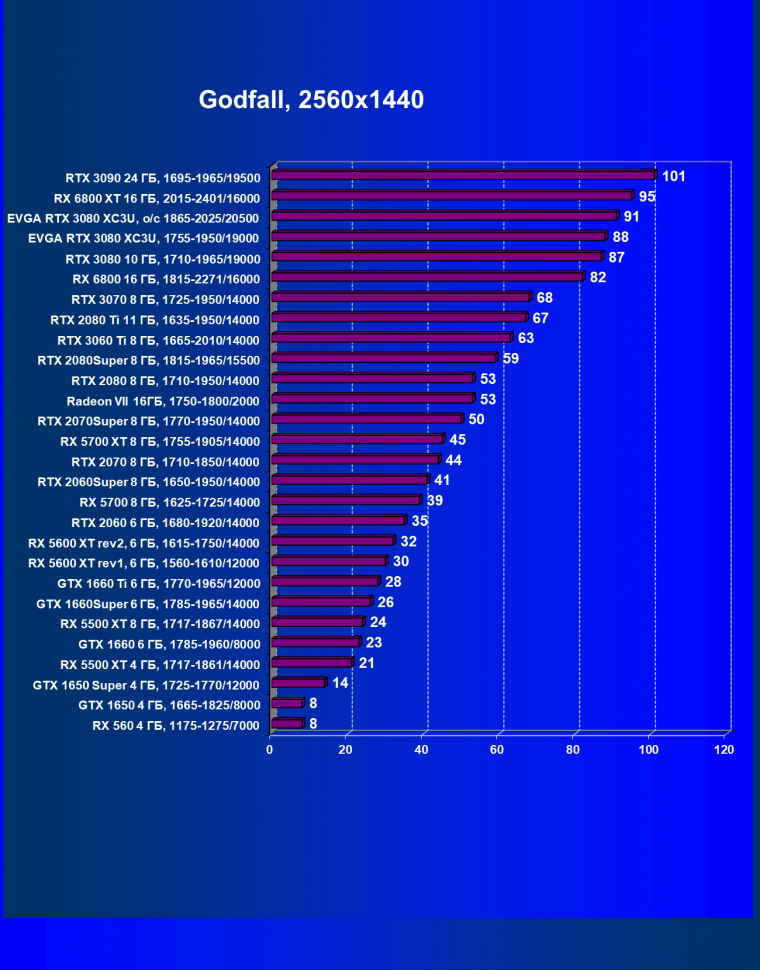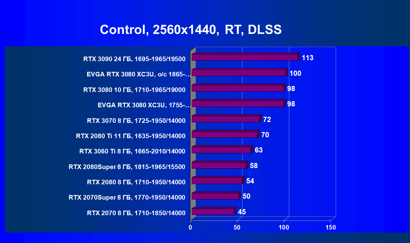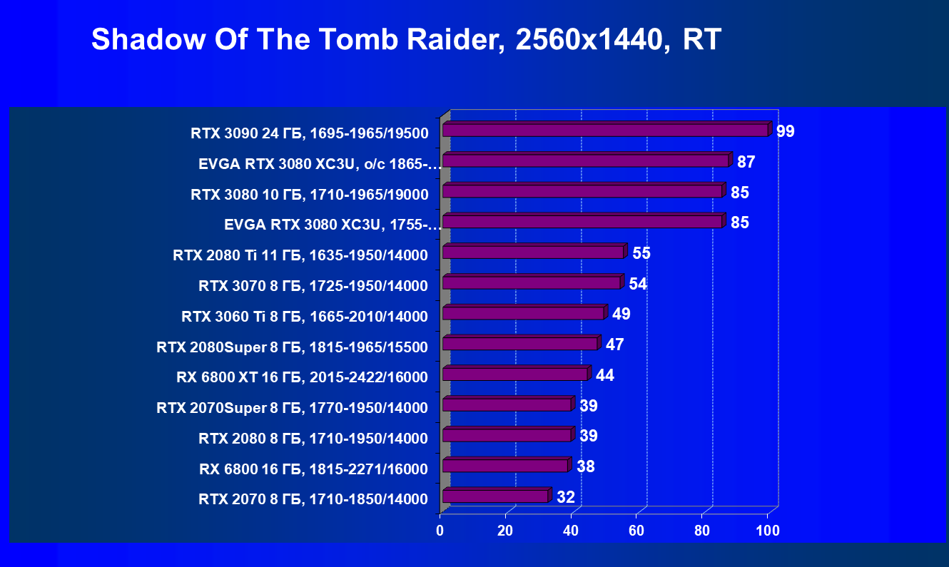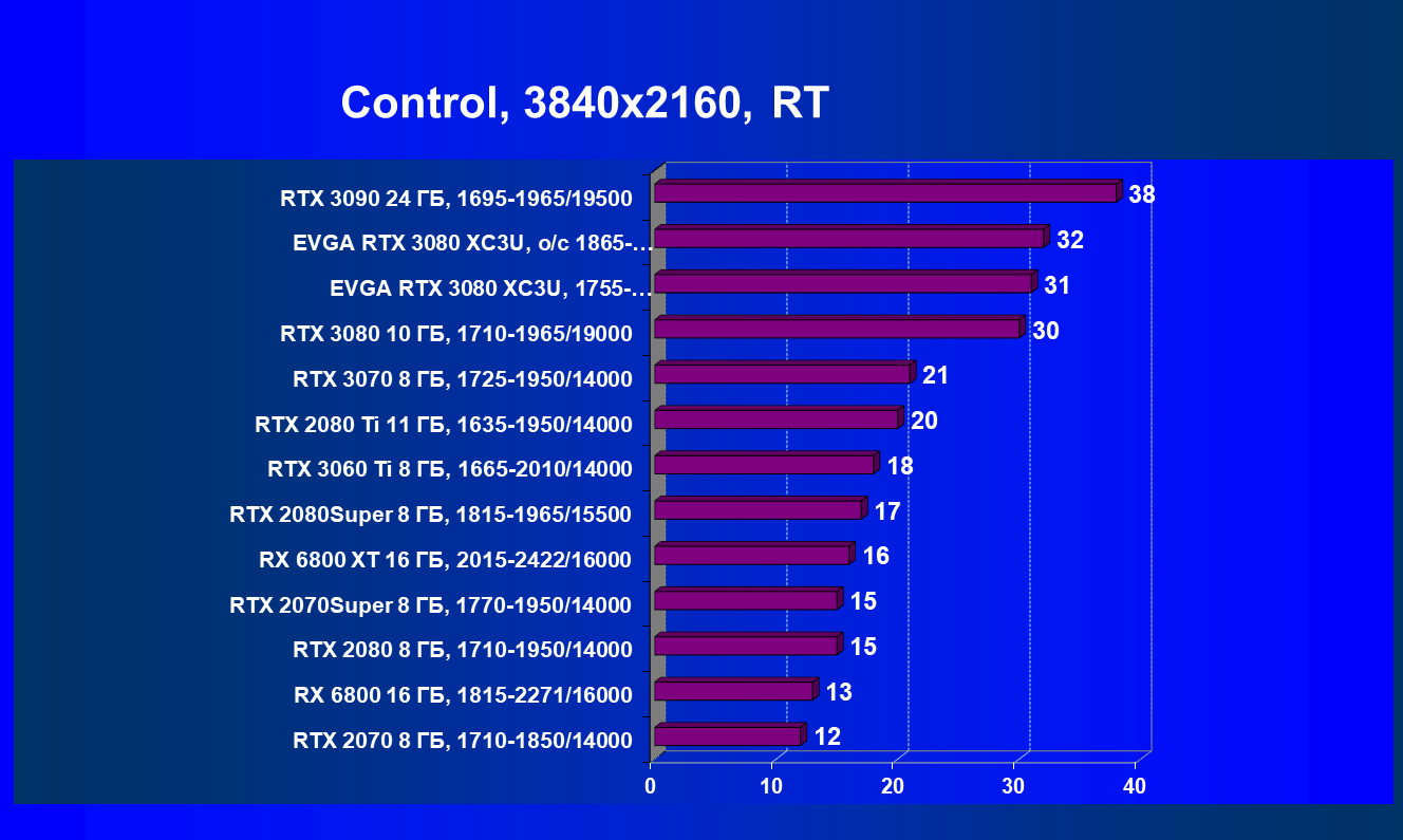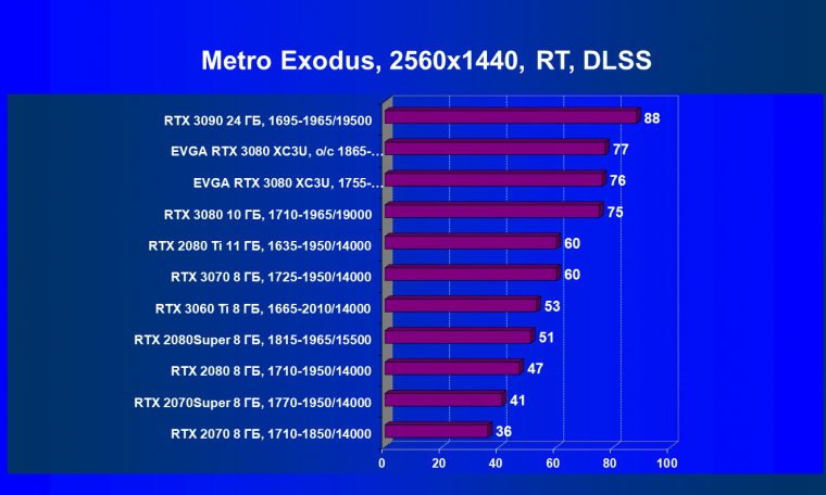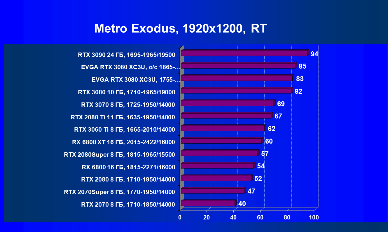 | 04 | EVGA RTX 3080 XC3U, разгон до 1865—2025/20500 | 278 | 2387 | 86 000 |