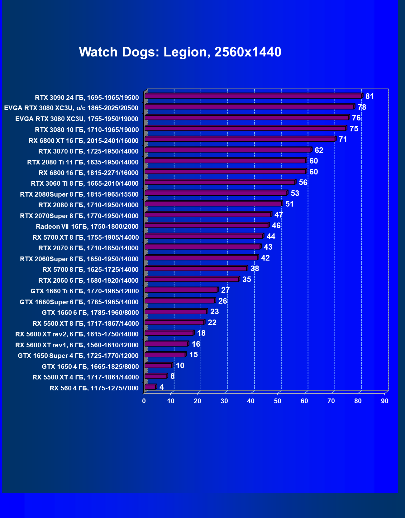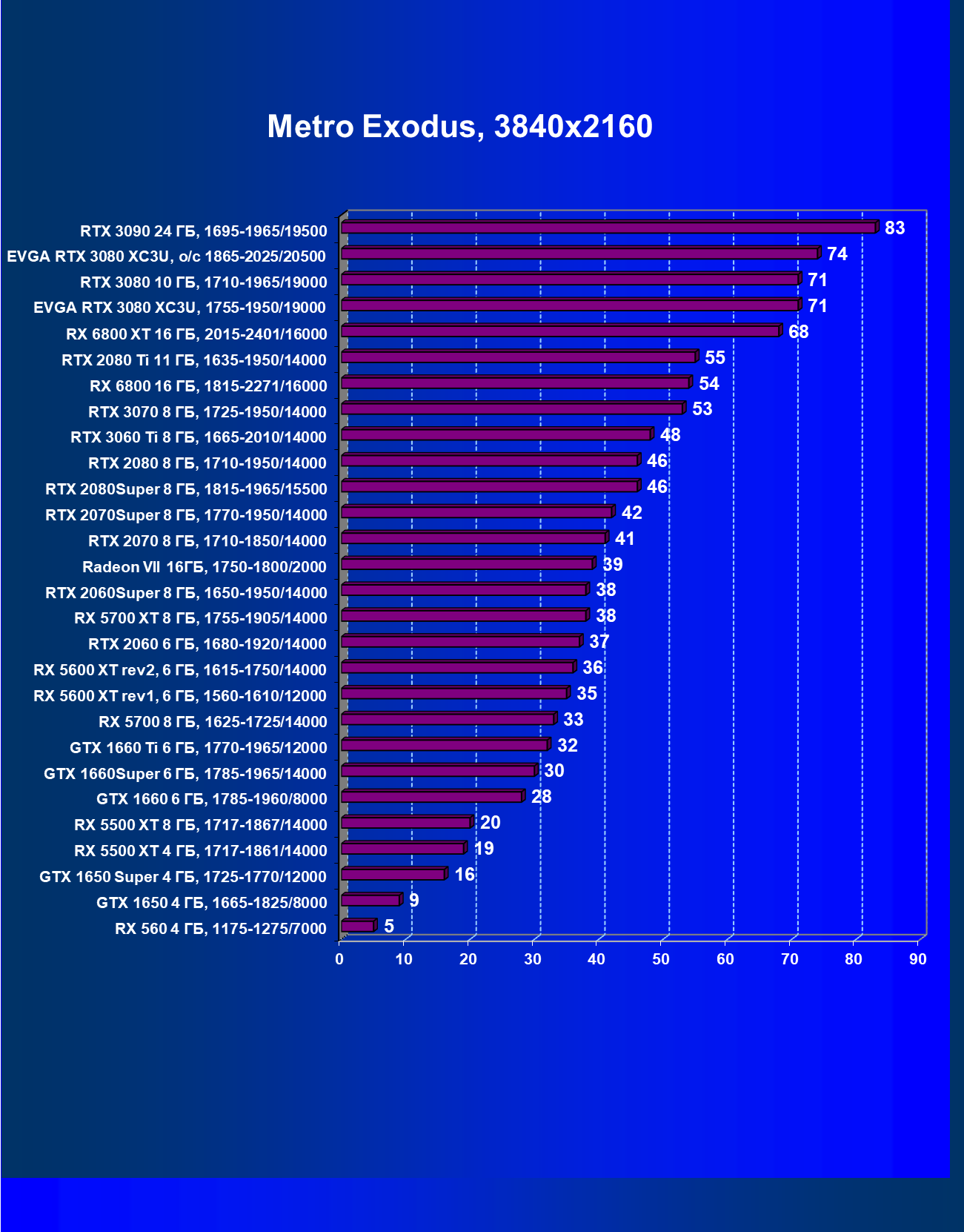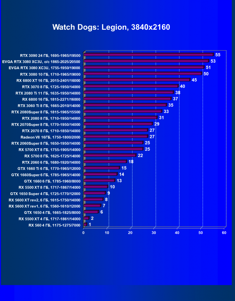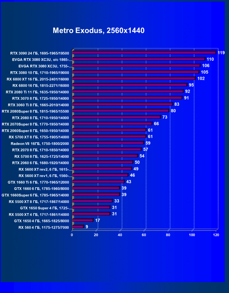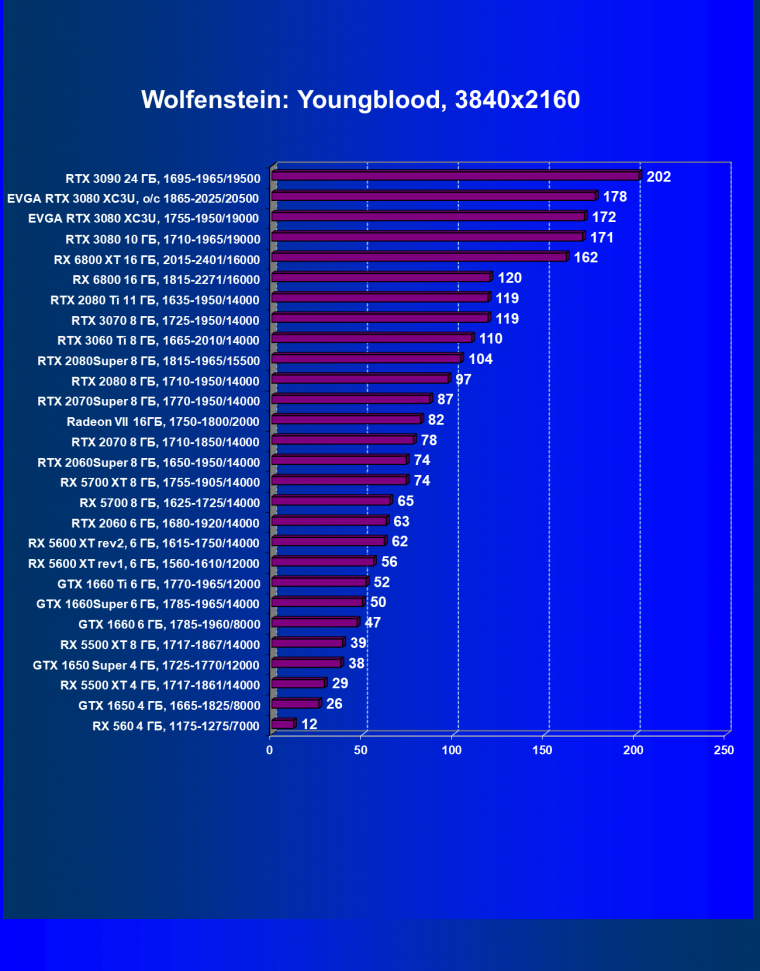 | 04 | EVGA RTX 3080 XC3U, разгон до 1865—2025/20500 | 278 | 2387 | 86 000 |