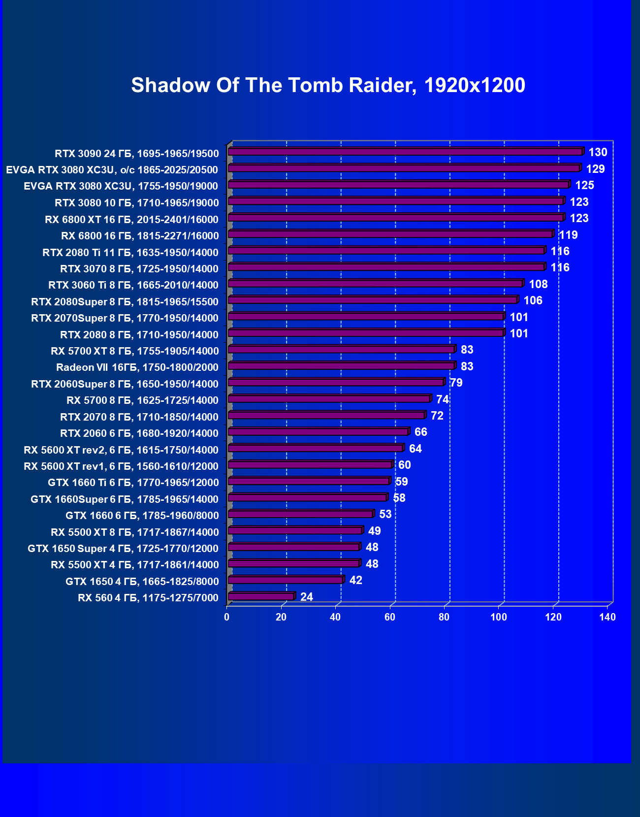 | 02 | EVGA RTX 3080 XC3U, разгон до 1865—2025/20500 | 1170 | 136 | 86 000 |