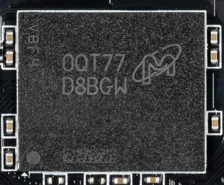 Карта имеет 10 ГБ памяти GDDR6X SDRAM, размещенной в 10 микросхемах по 8 Гбит на лицевой стороне PCB. Микросхемы памяти Micron (GDDR6X, MT61K256M32JE-19) рассчитаны на условную номинальную частоту работы в 4750 (19000) МГц. Расшифровщик кодов на упаковках FBGA находится здесь.