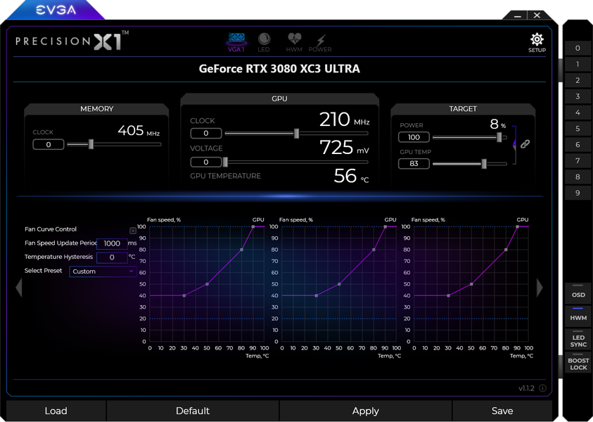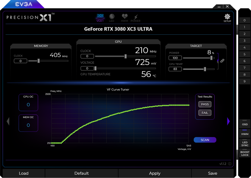 Управление работой карты обеспечивается силами фирменной утилиты EVGA Precision X1. Кстати, стоит упомянуть, что я попробовал ручной разгон и после экспериментов вышел на стабильную работу при увеличении частоты ядра на 110 МГц, а памяти — на 755 МГц. Получил при этом максимум по частотам 1865—2025/20500 МГц и прирост производительности в среднем 2,5% (в разрешении 4К — более +3% относительно референс-значений). При этом максимум энергопотребления почти не изменился и составил 332 Вт.