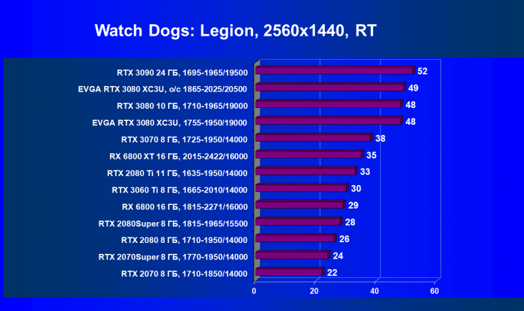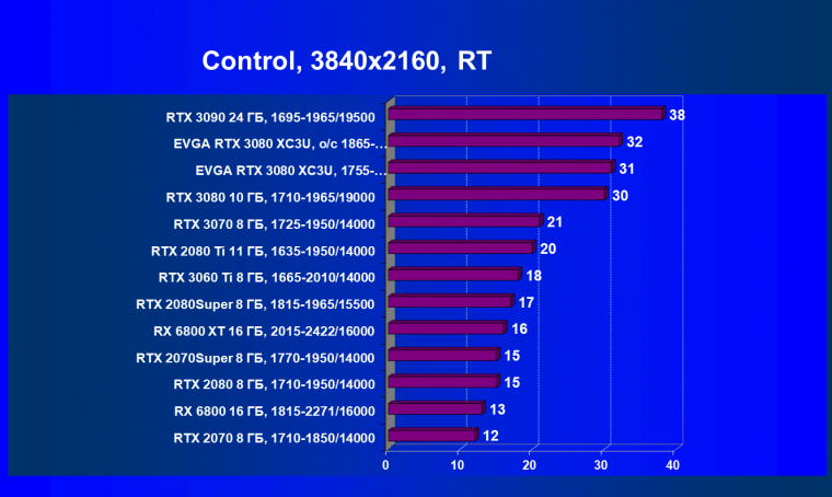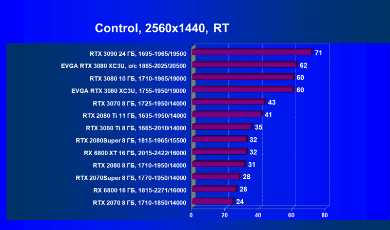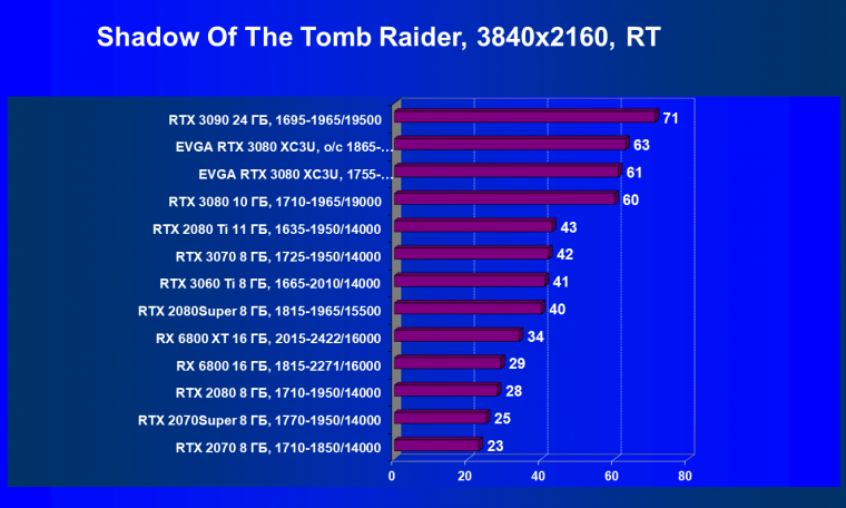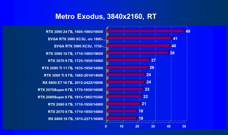 Если взять чистую производительность в играх без использования трассировки лучей и DLSS, то Radeon RX 6800 XT и GeForce RTX 3080 идут рядом, обеспечивая практически одинаковую производительность в играх. Карта EVGA вырвалась чуть-чуть вперед исключительно за счет фабричного разгона.