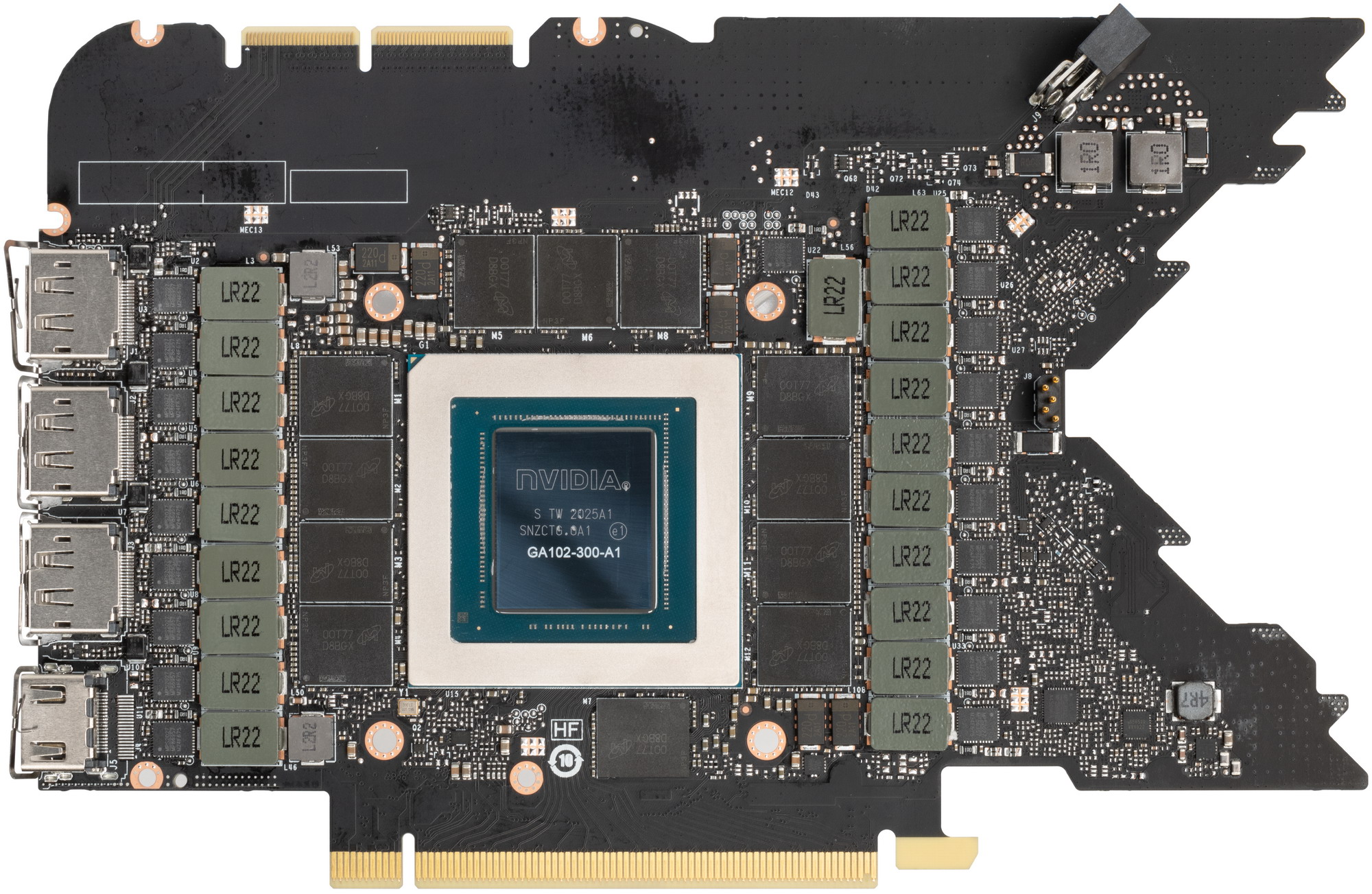 Карта имеет 24 ГБ памяти GDDR6X SDRAM, размещенной в 24 микросхемах по 8 Гбит на обеих сторонах PCB (по 12 на каждой). Микросхемы памяти Micron (GDDR6X, MT61K256M32JE-21) рассчитаны на номинальную частоту работы в 5250 (21000) МГц. Расшифровщик кодов на упаковках FBGA находится здесь.