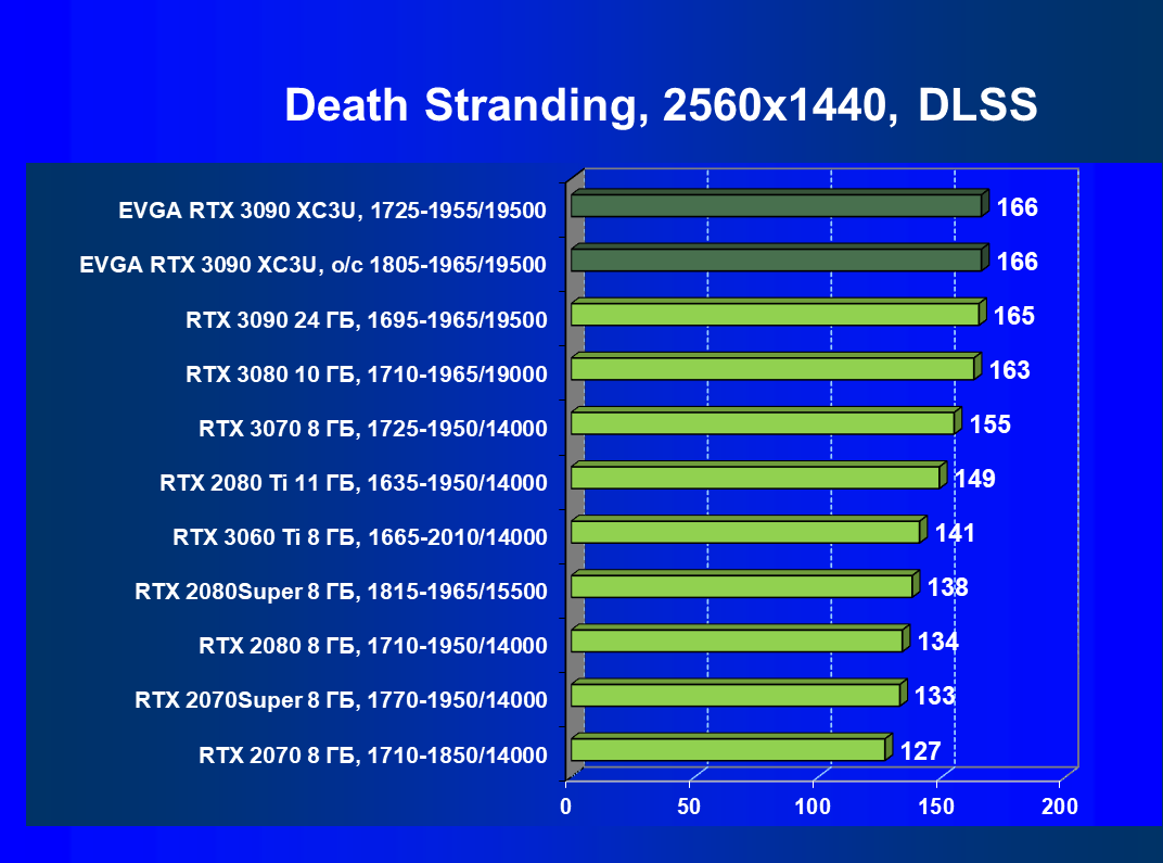 Штатные частоты памяти у карты EVGA равны референсным значениям, а вот Boost-частота работы ядра немного выше (1725 против 1695 МГц), однако прибавку к производительности это дает совсем небольшую (не более 1,5%), к тому же максимальное значение частоты работы ядра оказалось чуть ниже, чем у карты FE. Максимальное потребление карты EVGA — 356 Вт.