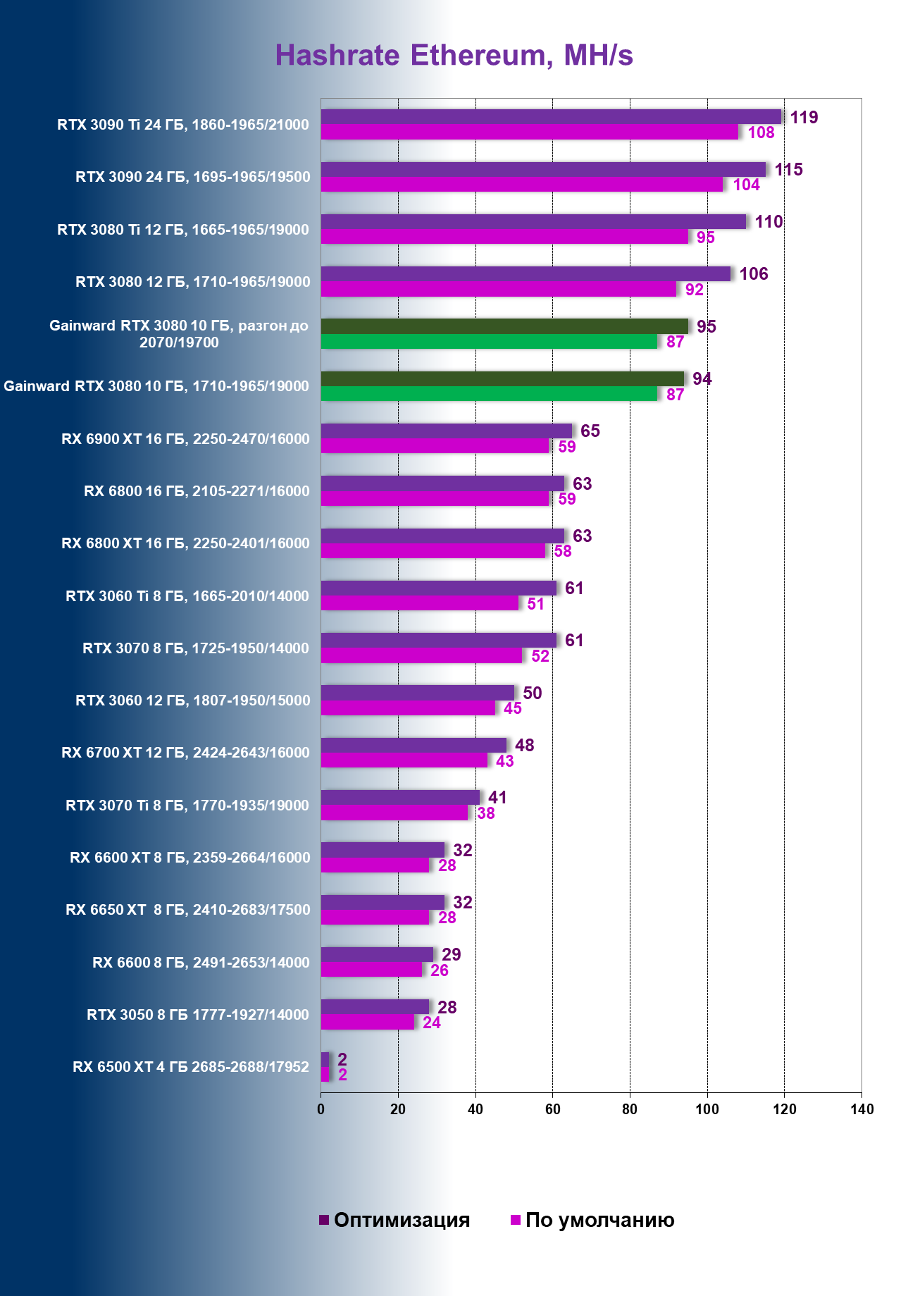 | 02 | Gainward RTX 3080 10 ГБ, 1710—1965/19000 | 148 | 873 | 59 000 |
