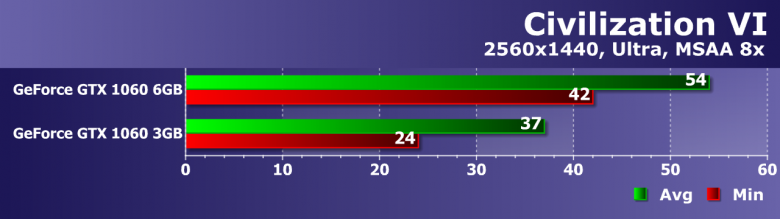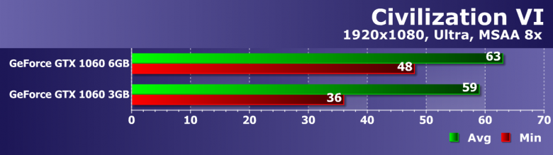 Как хорошо видно на диаграмме, разница между вариантами GeForce GTX 1060 с 3 ГБ и 6 ГБ в таких условиях получилась весьма ощутимой, особенно по минимальной частоте кадров. Впрочем, так как все показанные значения оказались выше 30 FPS, то их можно принять практически равными — на играбельность это не повлияет, и уж тем более — в пошаговой стратегии.