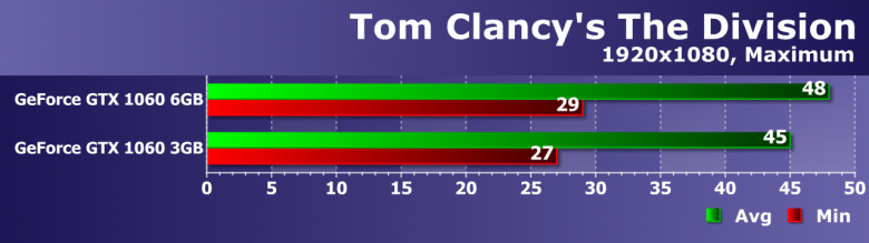 Первый вариант мы видели в игре The Division. Даже несмотря на нехватку видеопамяти у варианта GeForce GTX 1060 3 ГБ его производительность была примерно на уровне модели с вдвое большим объемом локальной памяти. Так получилось потому, что игра умеет подстраиваться под имеющийся объем VRAM, используя текстуры с различным разрешением для видеокарт с разным объемом видеопамяти. И в таких случаях разницы в частоте кадров не будет, зато она появится в качестве картинки, хоть это и не всегда легко заметить. А бывает, что игра динамически изменяет разрешение рендеринга таким образом, чтобы производительность не просаживалась ниже определенной отметки.