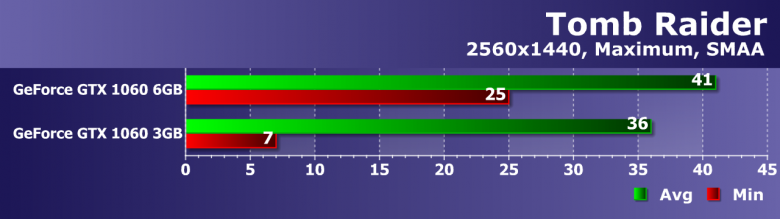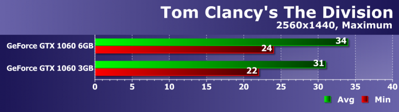В более высоком разрешении положение варианта GeForce GTX 1060 с 3 ГБ памяти усугубилось. Разница между минимальными значениями частоты кадров почти такая же, и она будет заметна даже невооруженным глазом. По средним показателям частоты кадров разница между 3 и 6 ГБ также увеличилась, и она уже превышает разницу в теоретических показателях скорости текстурирования и математических вычислений для пары GTX 1060. Впрочем, по опыту реальной игры, наличие 3 ГБ VRAM практически не мешает играть, и видеокарта с бо́льшим объемом видеопамяти быстрее несущественно.